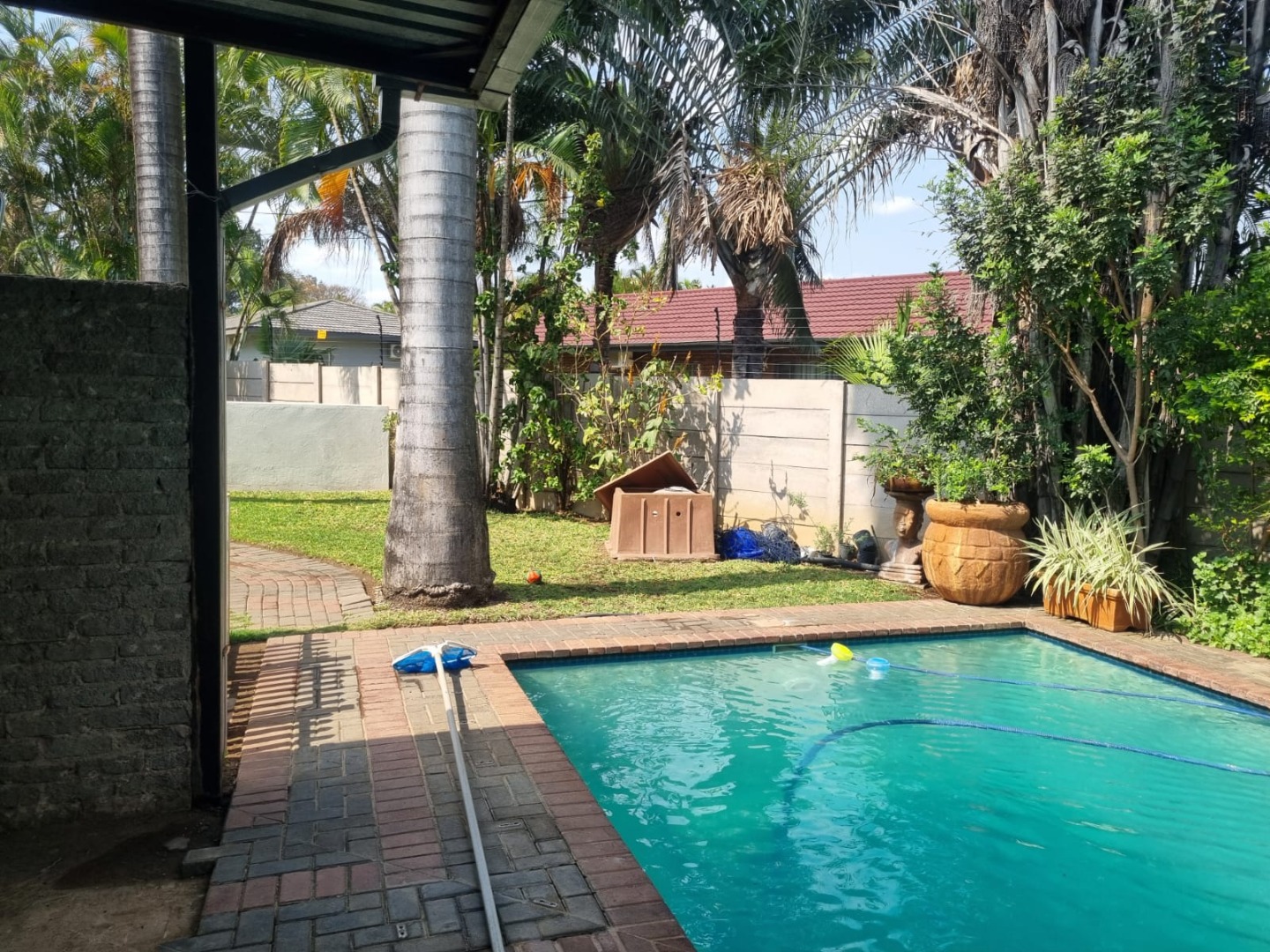 Outside, you’ll find a refreshing swimming pool, a well-maintained garden, and paved areas perfect for outdoor enjoyment. The property also offers three convenient parking spaces and features a secure access gate, contributing to a safe environment. This pet-friendly home is ideally situated in a tranquil suburban setting, striking a balance between comfort and accessibility to local amenities.