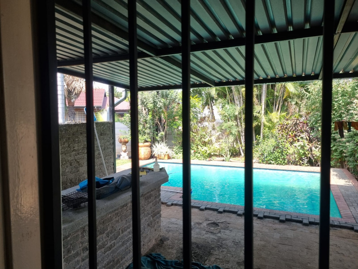 Outside, you’ll find a refreshing swimming pool, a well-maintained garden, and paved areas perfect for outdoor enjoyment. The property also offers three convenient parking spaces and features a secure access gate, contributing to a safe environment. This pet-friendly home is ideally situated in a tranquil suburban setting, striking a balance between comfort and accessibility to local amenities.