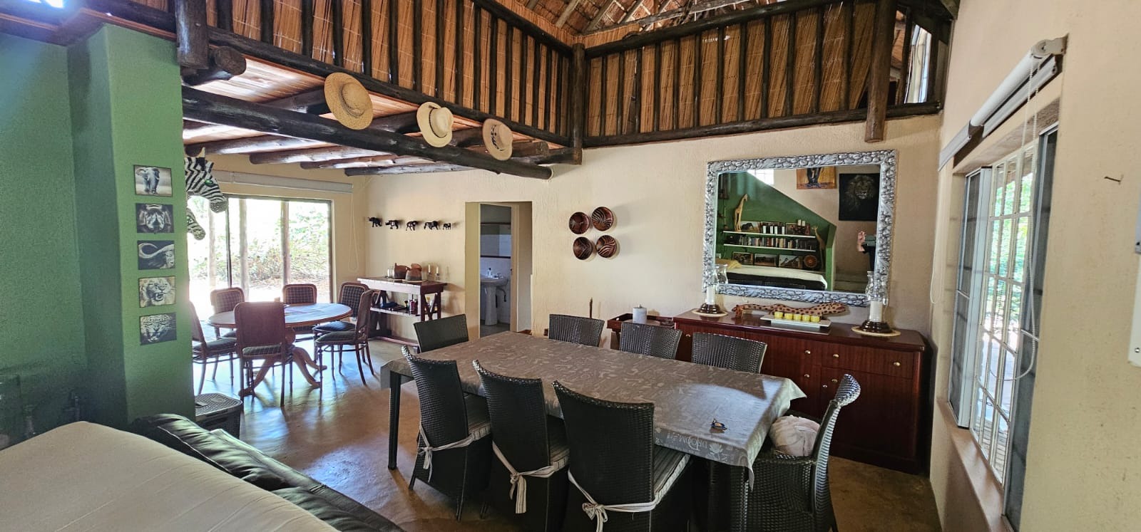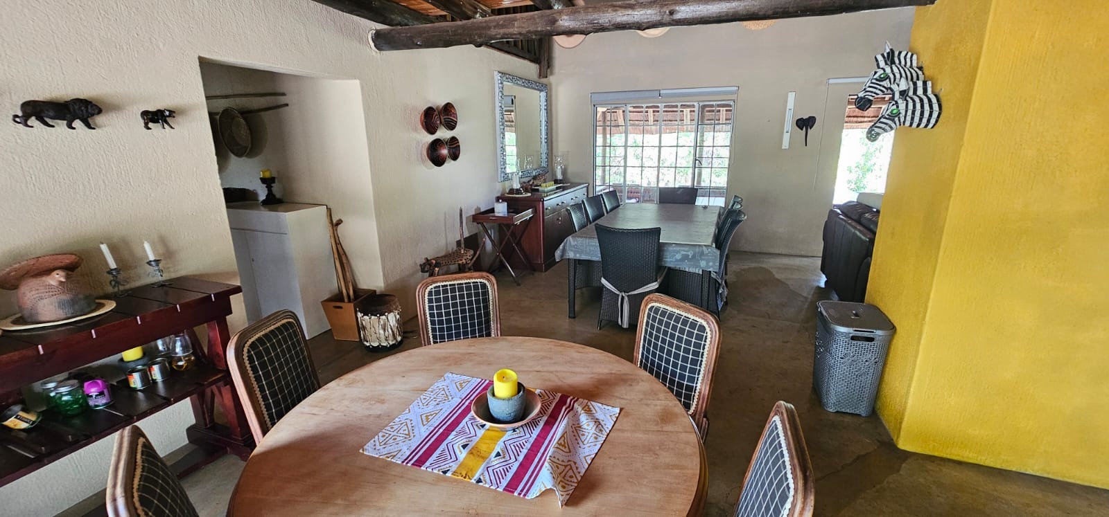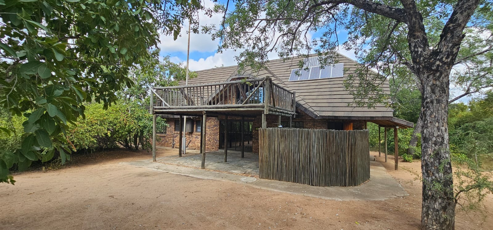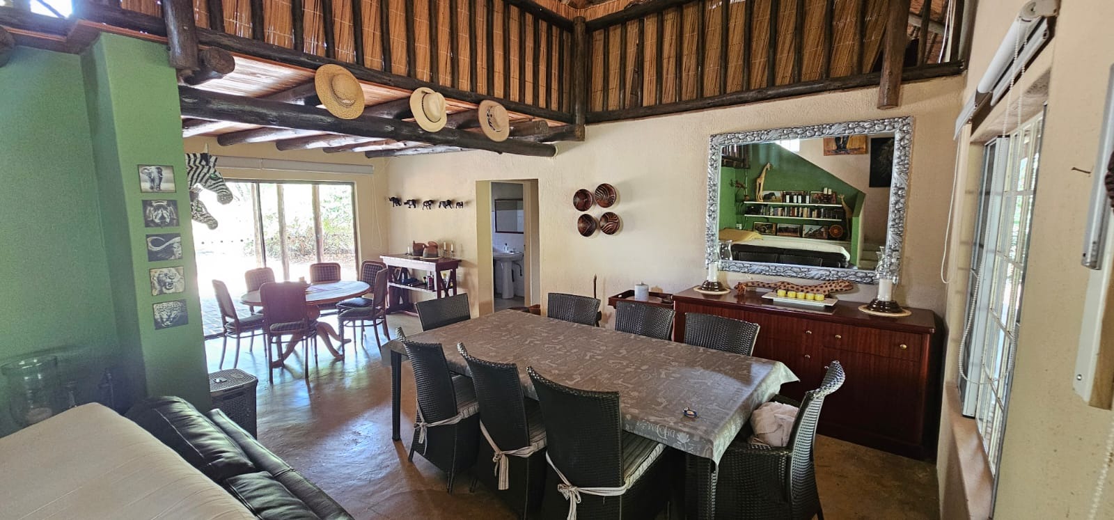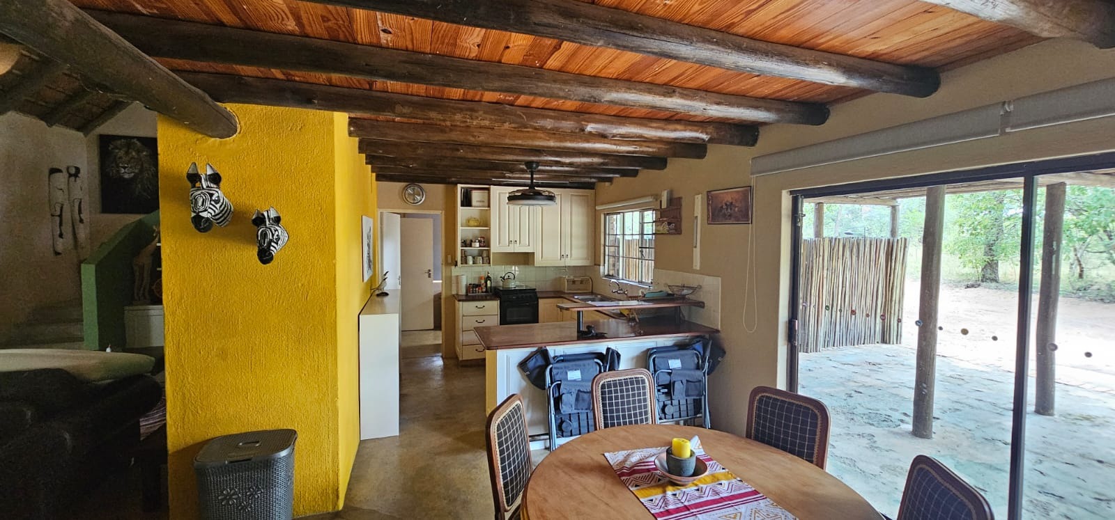Nestled within the tranquil Sabie Park in Bushbuckridge, this unique 2-bedroom, 2-bathroom residence offers a distinctive blend of rustic charm and natural seclusion. The multi-gabled brick architecture, complemented by a welcoming covered porch, creates an inviting first impression, set against a backdrop of mature trees ensuring privacy and a true bushveld feel. Step inside to discover an expansive open-plan living and dining area, characterized by high ceilings and exposed wooden beams that evoke a safari-lodge aesthetic. Large sliding glass doors flood the space with natural light and seamlessly connect to the outdoors. The functional kitchen, complete with a scullery and ample storage, caters to all culinary needs, while the unique African-inspired decor adds a vibrant, authentic touch throughout. The home features two comfortable bedrooms, with one offering the convenience of an en-suite bathroom. An additional guest toilet serves the main living areas. Practical elements like dedicated storage ensure a clutter-free environment, enhancing the overall liveability of this charming property. Embrace the outdoor lifestyle on this generous 6748 sqm erf, featuring a refreshing swimming pool and a deck perfect for relaxation or entertaining. The established garden provides a serene escape, while two open parking bays offer practical convenience. Enjoy scenic views from various vantage points, immersing yourself in the natural beauty of the surroundings. Security is paramount with 24-hour security, an access gate, electric fencing, and security posts, complemented by burglar bars on windows for peace of mind. A borehole ensures water resilience, adding to the property's self-sufficiency. Sabie Park, located in Bushbuckridge, South Africa, is renowned for its natural beauty and tranquil environment, offering an idyllic bushveld living experience. Key Features: * 2 Bedrooms, 2 Bathrooms (1 En-suite, 1 Guest Toilet) * Open-plan Living & Dining Area * Functional Kitchen with Scullery * Swimming Pool & Deck * Expansive 6748 sqm Erf with Garden * 2 Open Parking Bays * Borehole for Water Resilience * 24-Hour Security, Access Gate & Electric Fencing * Scenic Views