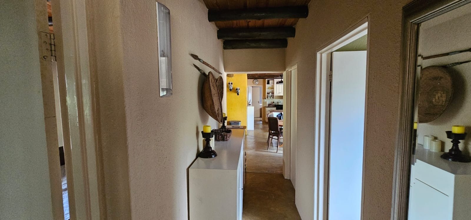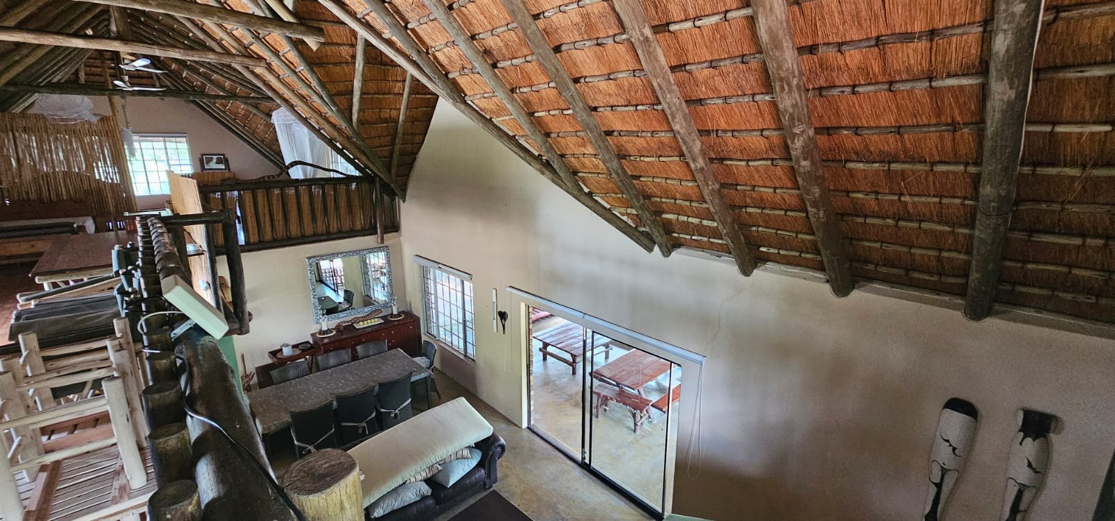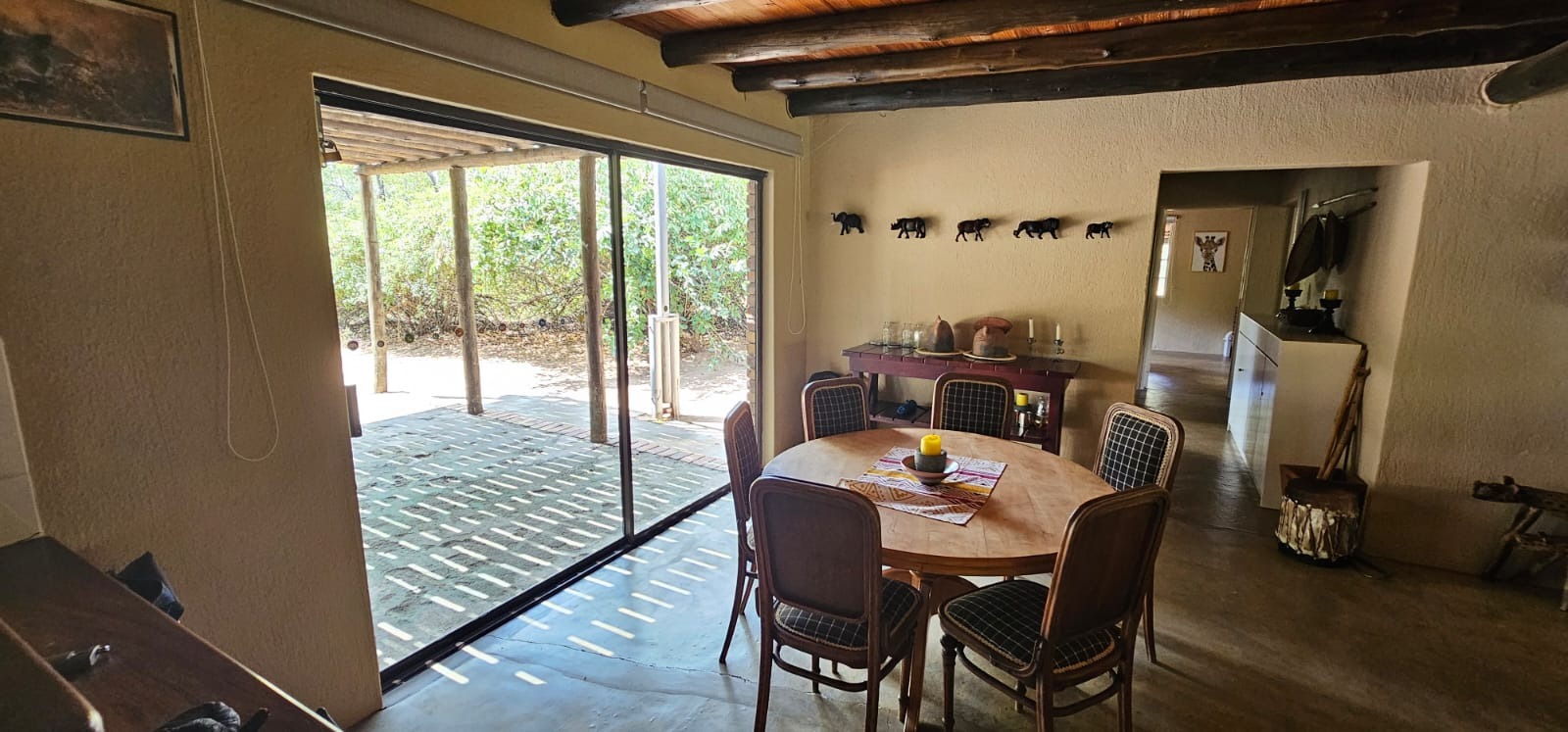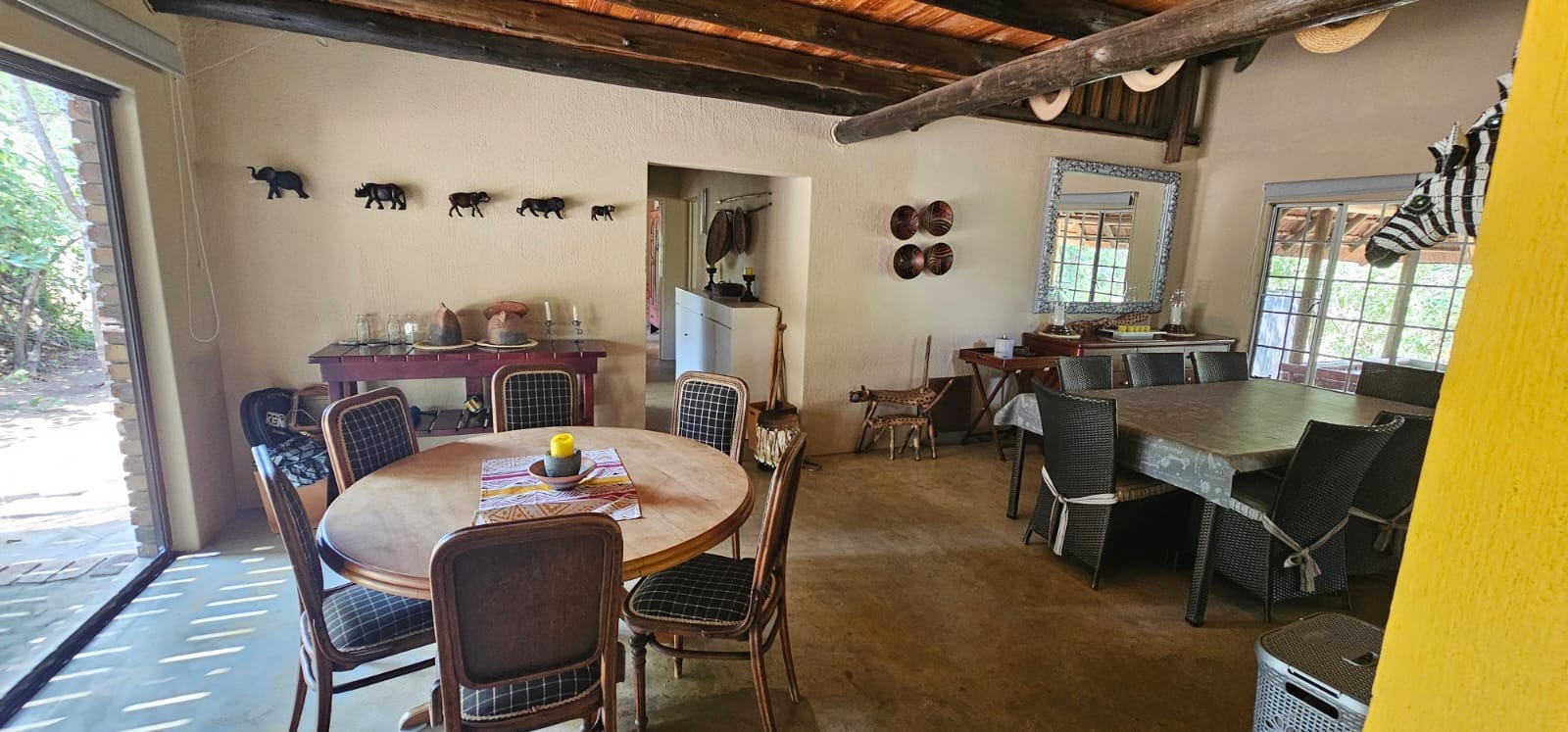 Nestled within the tranquil Sabie Park in Bushbuckridge, this unique 2-bedroom, 2-bathroom residence offers a distinctive blend of rustic charm and natural seclusion. The multi-gabled brick architecture, complemented by a welcoming covered porch, creates an inviting first impression, set against a backdrop of mature trees ensuring privacy and a true bushveld feel. Step inside to discover an expansive open-plan living and dining area, characterized by high ceilings and exposed wooden beams that evoke a safari-lodge aesthetic. Large sliding glass doors flood the space with natural light and seamlessly connect to the outdoors. The functional kitchen, complete with a scullery and ample storage, caters to all culinary needs, while the unique African-inspired decor adds a vibrant, authentic touch throughout. The home features two comfortable bedrooms, with one offering the convenience of an en-suite bathroom. An additional guest toilet serves the main living areas. Practical elements like dedicated storage ensure a clutter-free environment, enhancing the overall liveability of this charming property. Embrace the outdoor lifestyle on this generous 6748 sqm erf, featuring a refreshing swimming pool and a deck perfect for relaxation or entertaining. The established garden provides a serene escape, while two open parking bays offer practical convenience. Enjoy scenic views from various vantage points, immersing yourself in the natural beauty of the surroundings. Security is paramount with 24-hour security, an access gate, electric fencing, and security posts, complemented by burglar bars on windows for peace of mind. A borehole ensures water resilience, adding to the property's self-sufficiency. Sabie Park, located in Bushbuckridge, South Africa, is renowned for its natural beauty and tranquil environment, offering an idyllic bushveld living experience. Key Features: * 2 Bedrooms, 2 Bathrooms (1 En-suite, 1 Guest Toilet) * Open-plan Living & Dining Area * Functional Kitchen with Scullery * Swimming Pool & Deck * Expansive 6748 sqm Erf with Garden * 2 Open Parking Bays * Borehole for Water Resilience * 24-Hour Security, Access Gate & Electric Fencing * Scenic Views