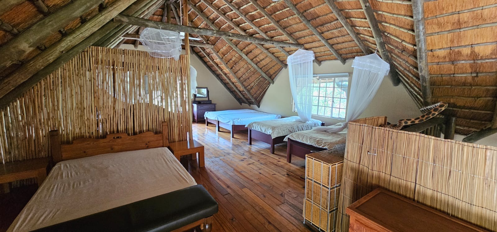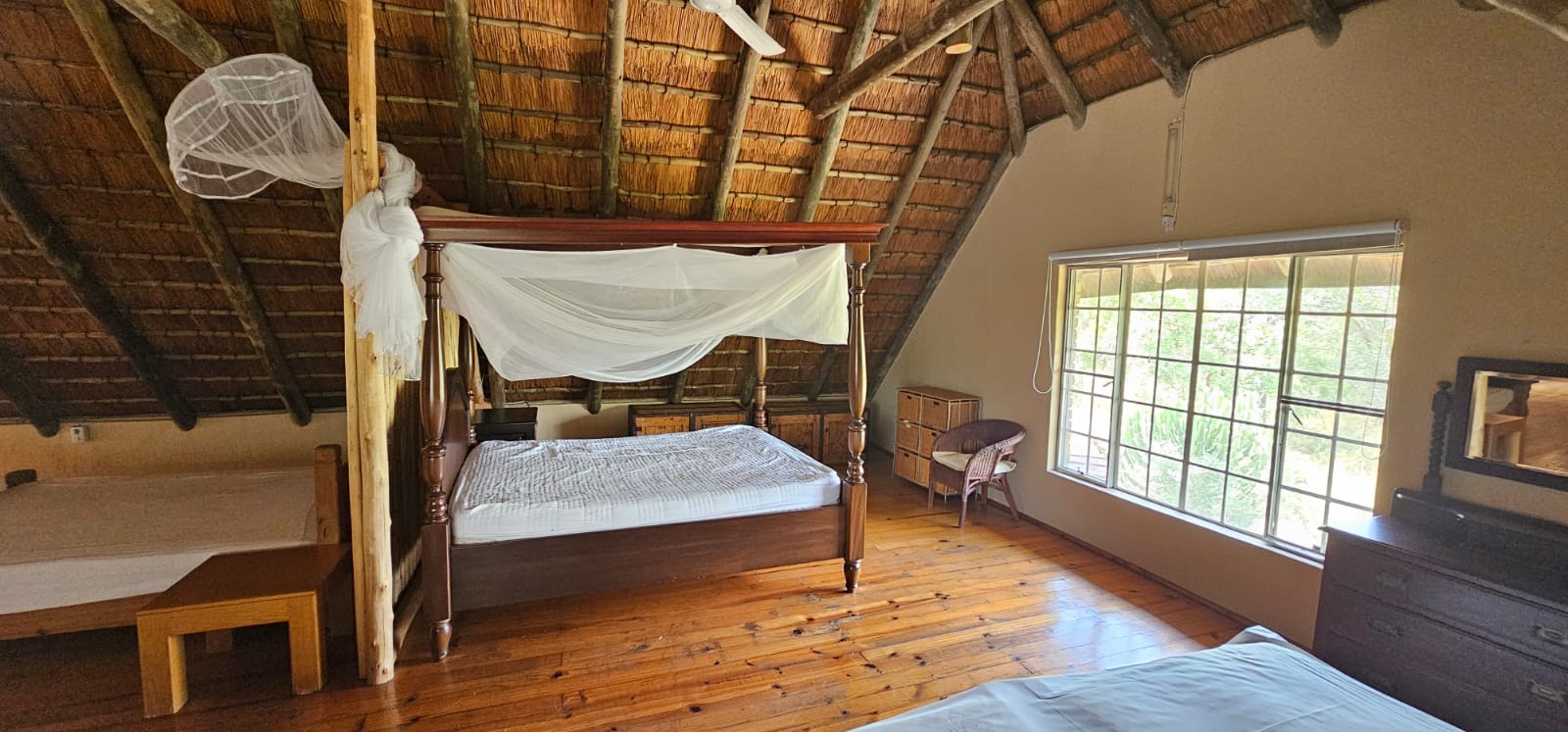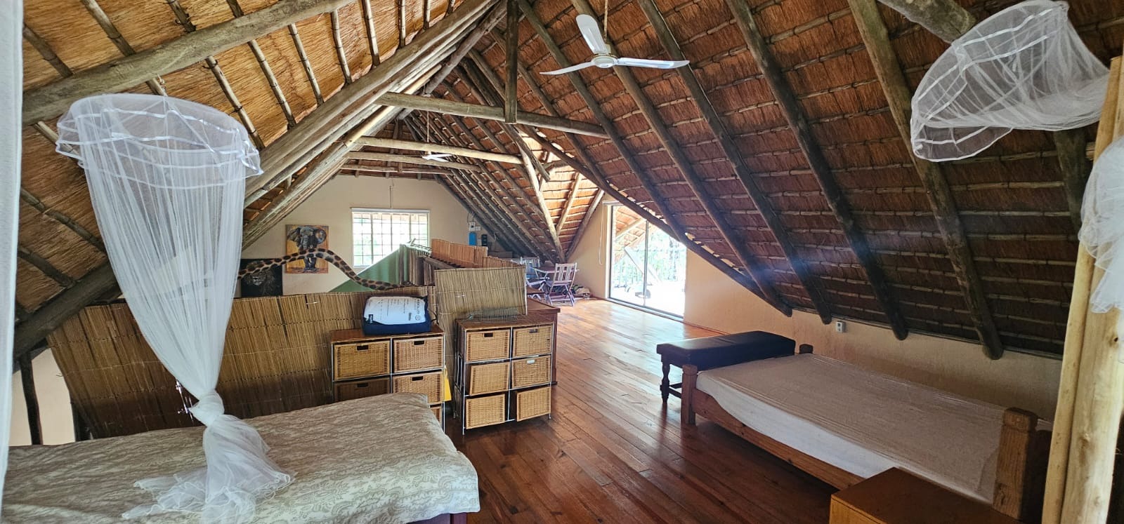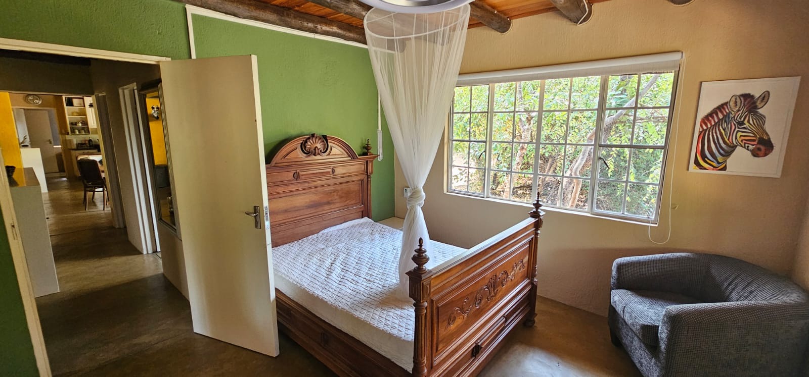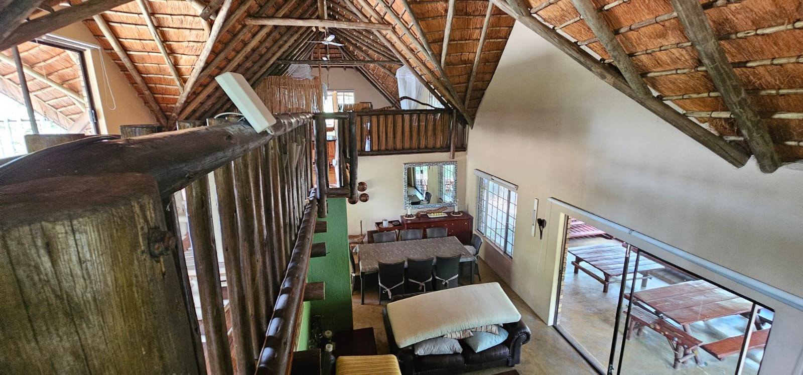 Nestled within the tranquil Sabie Park in Bushbuckridge, this unique 2-bedroom, 2-bathroom residence offers a distinctive blend of rustic charm and natural seclusion. The multi-gabled brick architecture, complemented by a welcoming covered porch, creates an inviting first impression, set against a backdrop of mature trees ensuring privacy and a true bushveld feel. Step inside to discover an expansive open-plan living and dining area, characterized by high ceilings and exposed wooden beams that evoke a safari-lodge aesthetic. Large sliding glass doors flood the space with natural light and seamlessly connect to the outdoors. The functional kitchen, complete with a scullery and ample storage, caters to all culinary needs, while the unique African-inspired decor adds a vibrant, authentic touch throughout. The home features two comfortable bedrooms, with one offering the convenience of an en-suite bathroom. An additional guest toilet serves the main living areas. Practical elements like dedicated storage ensure a clutter-free environment, enhancing the overall liveability of this charming property. Embrace the outdoor lifestyle on this generous 6748 sqm erf, featuring a refreshing swimming pool and a deck perfect for relaxation or entertaining. The established garden provides a serene escape, while two open parking bays offer practical convenience. Enjoy scenic views from various vantage points, immersing yourself in the natural beauty of the surroundings. Security is paramount with 24-hour security, an access gate, electric fencing, and security posts, complemented by burglar bars on windows for peace of mind. A borehole ensures water resilience, adding to the property's self-sufficiency. Sabie Park, located in Bushbuckridge, South Africa, is renowned for its natural beauty and tranquil environment, offering an idyllic bushveld living experience. Key Features: * 2 Bedrooms, 2 Bathrooms (1 En-suite, 1 Guest Toilet) * Open-plan Living & Dining Area * Functional Kitchen with Scullery * Swimming Pool & Deck * Expansive 6748 sqm Erf with Garden * 2 Open Parking Bays * Borehole for Water Resilience * 24-Hour Security, Access Gate & Electric Fencing * Scenic Views