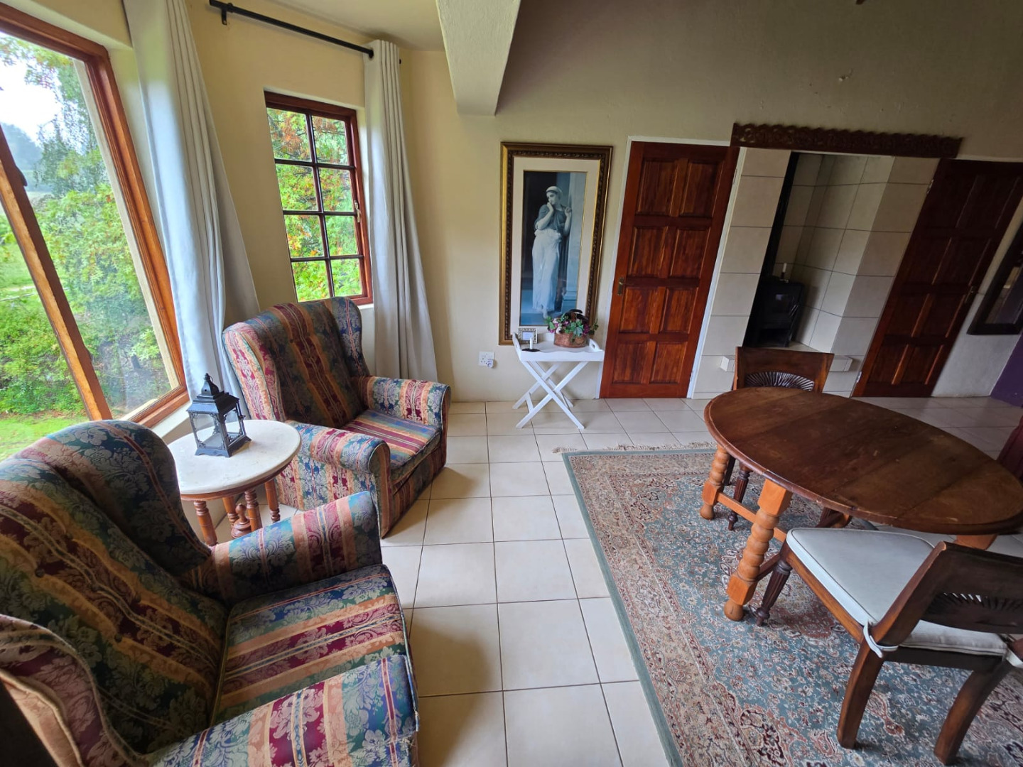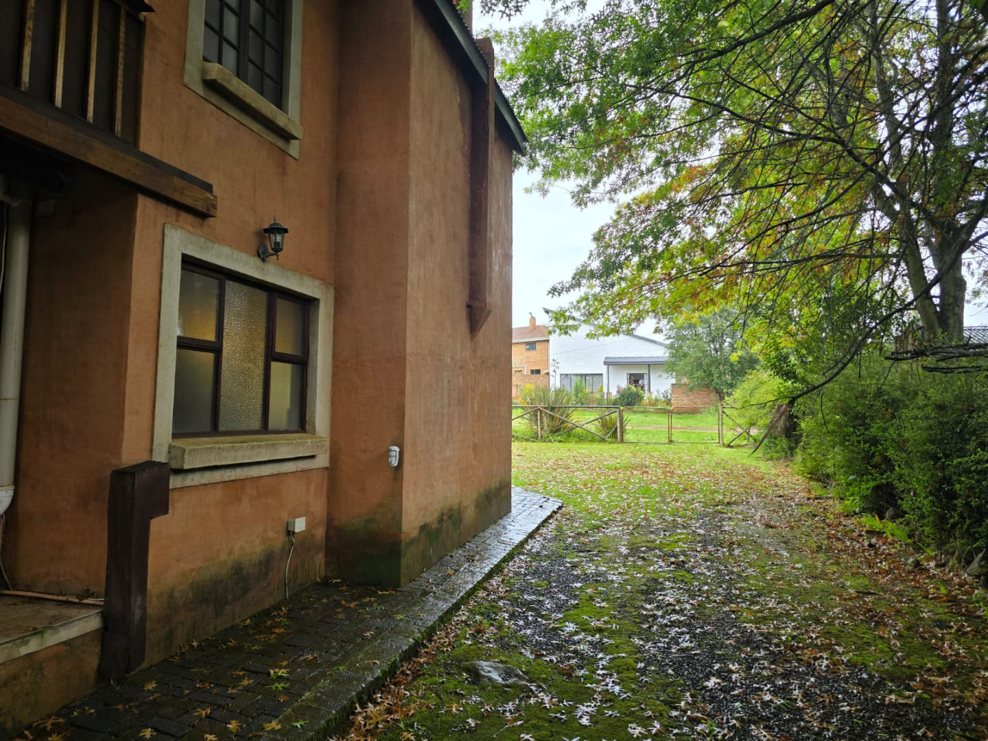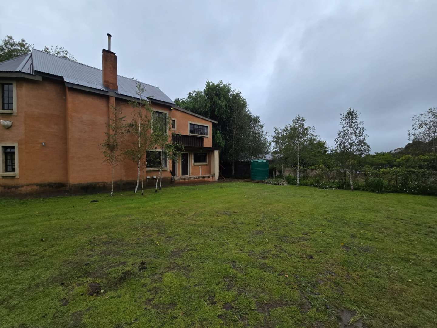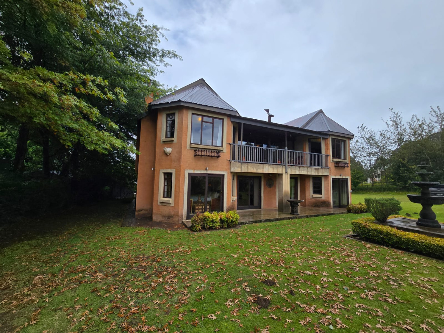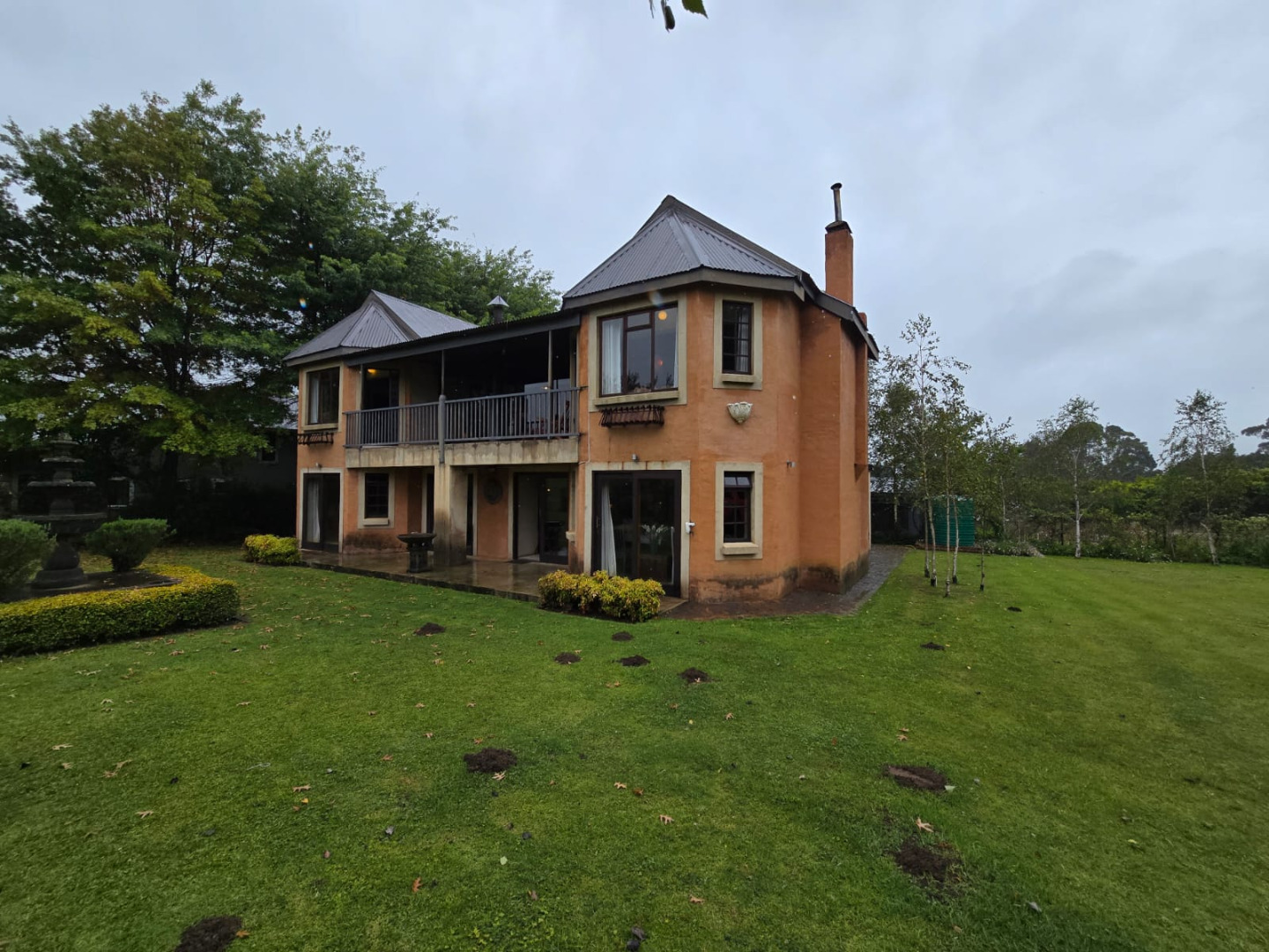 Nestled in the picturesque town of Dullstroom, this distinctive property offers a unique blend of rustic charm and spacious living, ideal for those seeking a tranquil South African lifestyle. The residence, set on a generous 1400 sqm erf, presents a striking kerb appeal with its warm-toned, possibly Tuscan-inspired exterior, featuring unique rounded architectural sections and a corrugated metal roof. Large windows and glass doors throughout ensure an abundance of natural light, creating an inviting atmosphere from the moment you arrive. The expansive green lawn, mature trees, and a decorative garden fountain contribute to a serene outdoor environment, complemented by scenic views of the natural hilly surroundings.