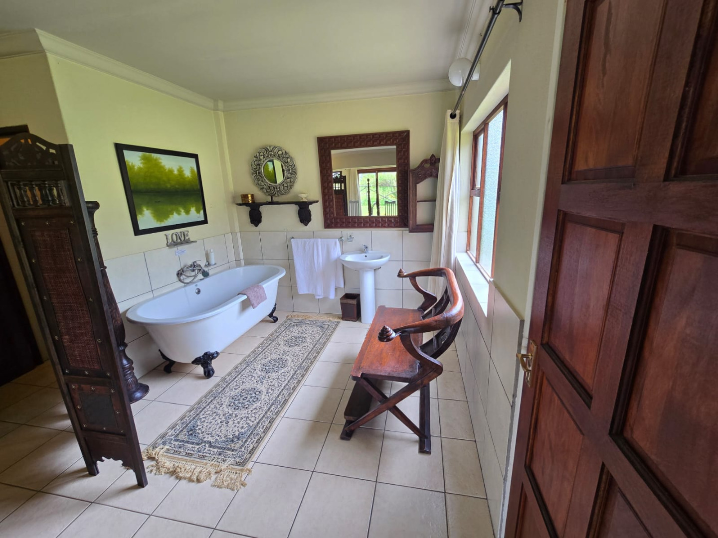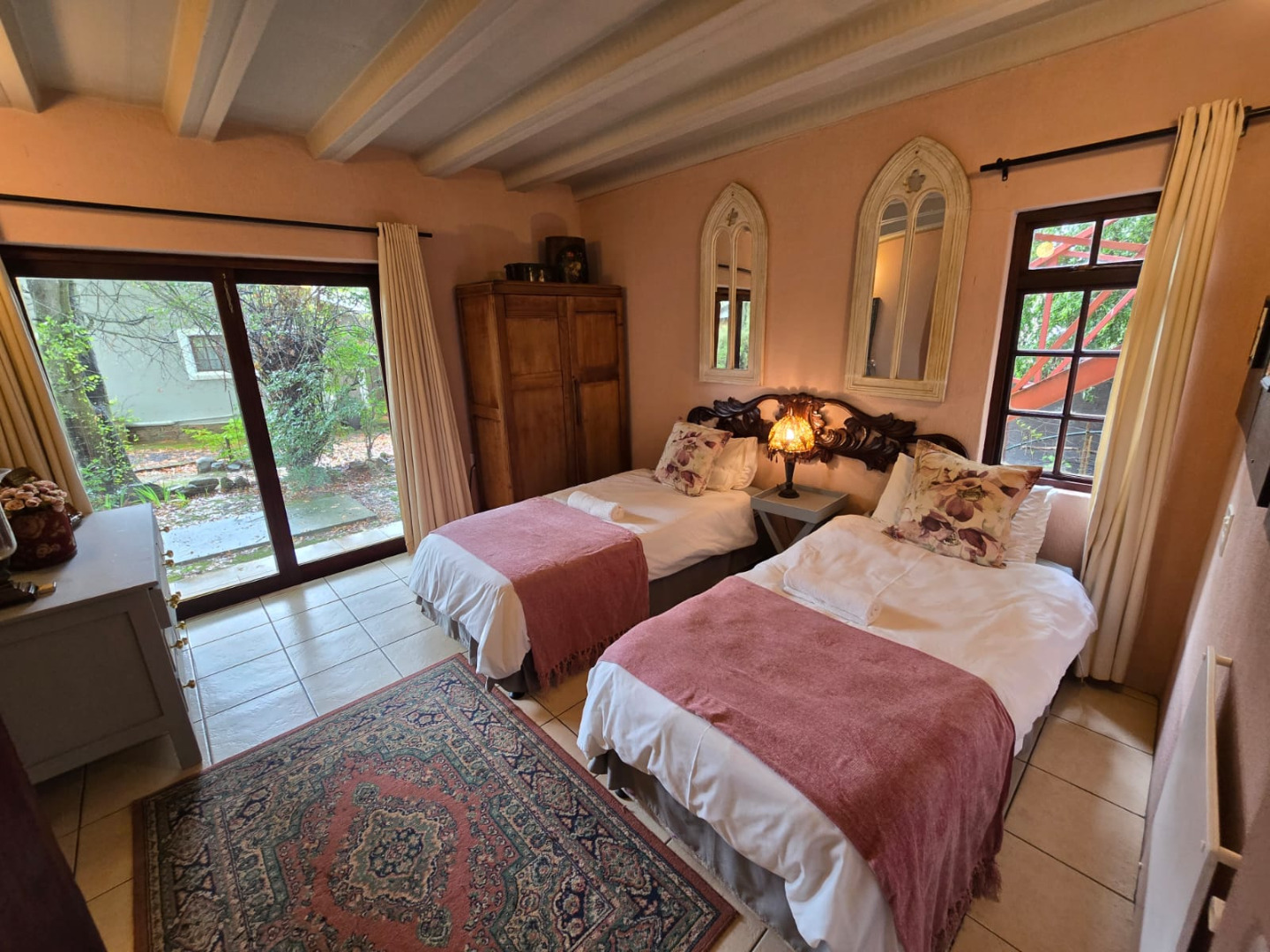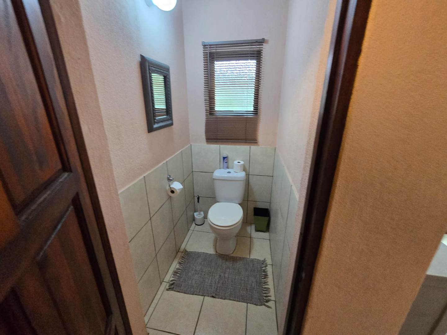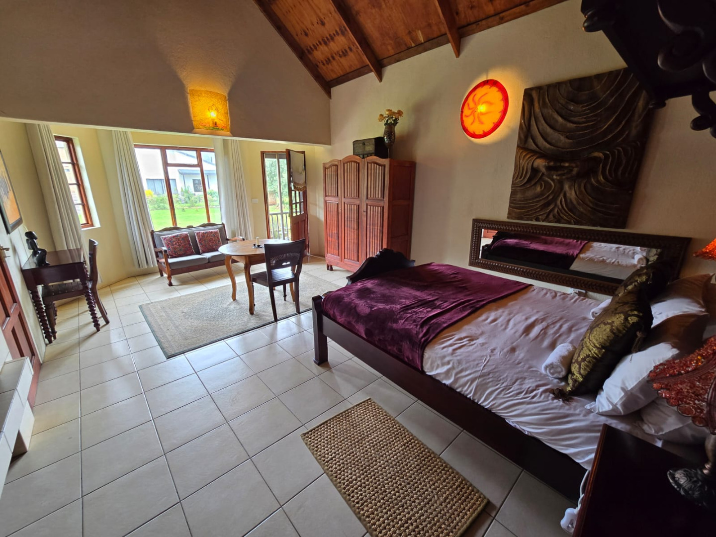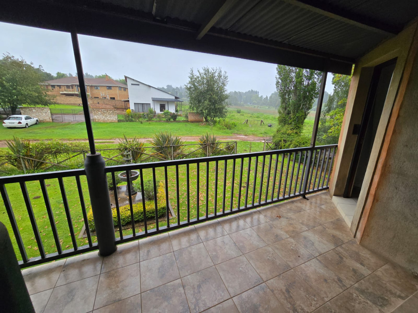 Nestled in the picturesque town of Dullstroom, this distinctive property offers a unique blend of rustic charm and spacious living, ideal for those seeking a tranquil South African lifestyle. The residence, set on a generous 1400 sqm erf, presents a striking kerb appeal with its warm-toned, possibly Tuscan-inspired exterior, featuring unique rounded architectural sections and a corrugated metal roof. Large windows and glass doors throughout ensure an abundance of natural light, creating an inviting atmosphere from the moment you arrive. The expansive green lawn, mature trees, and a decorative garden fountain contribute to a serene outdoor environment, complemented by scenic views of the natural hilly surroundings.