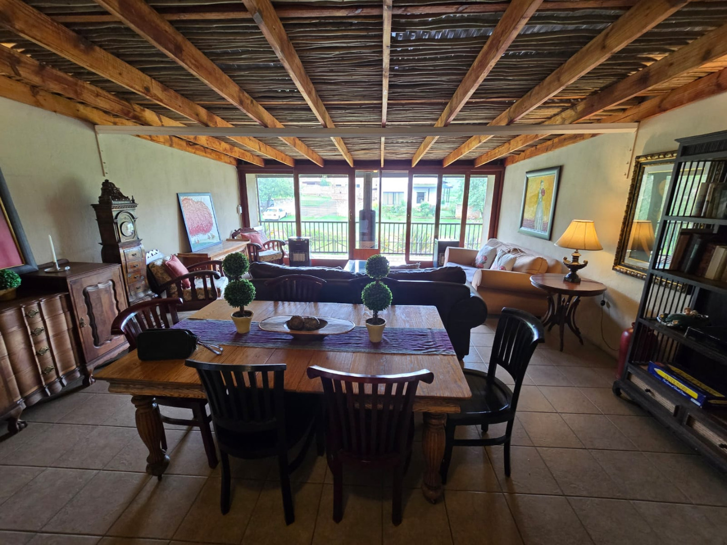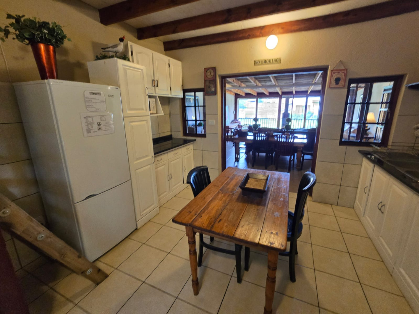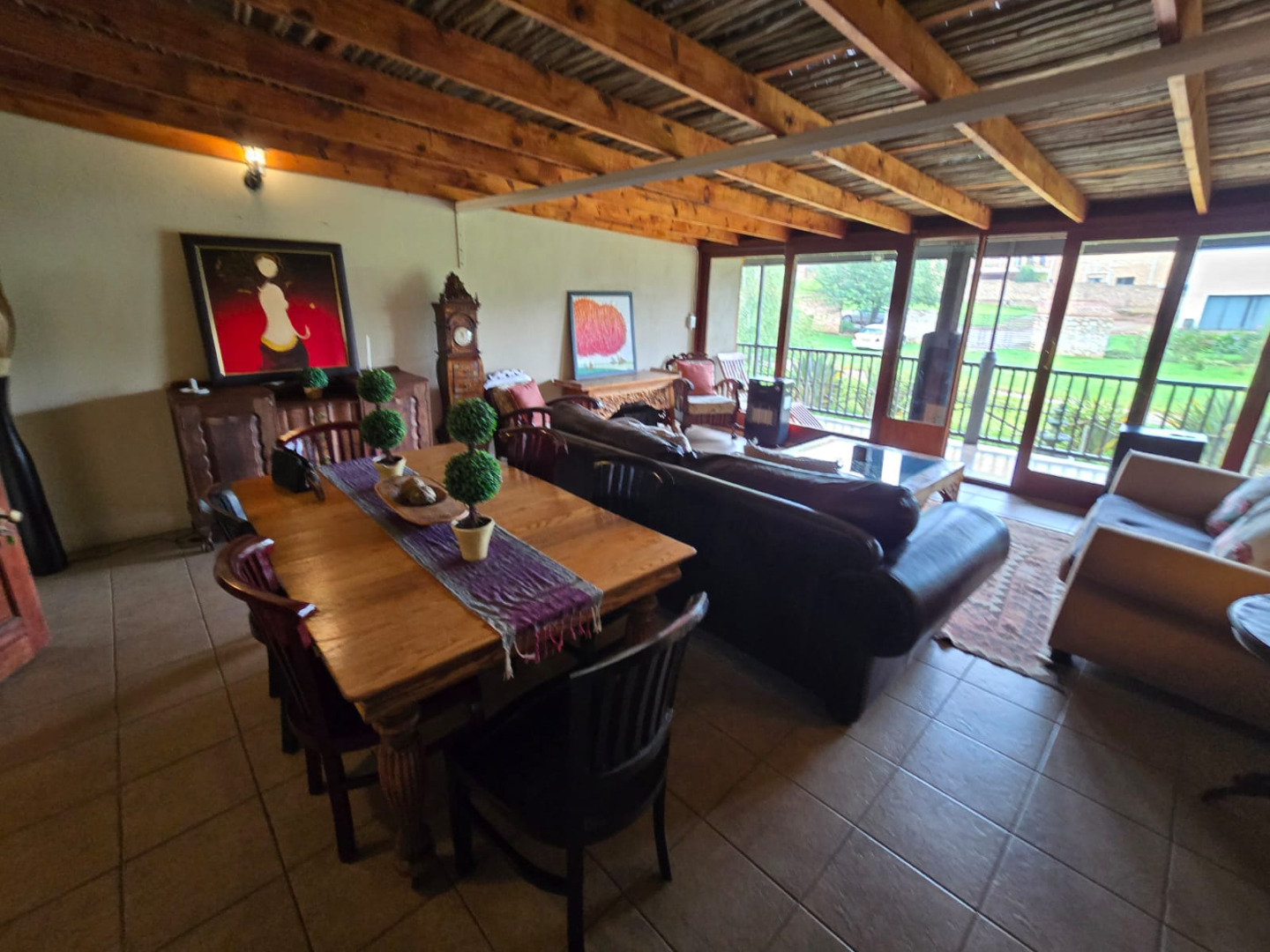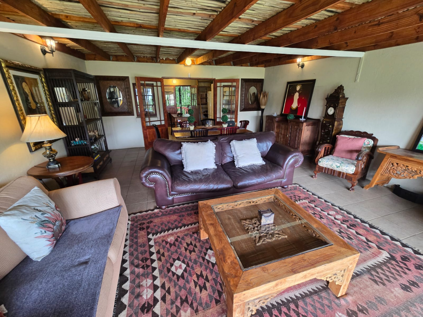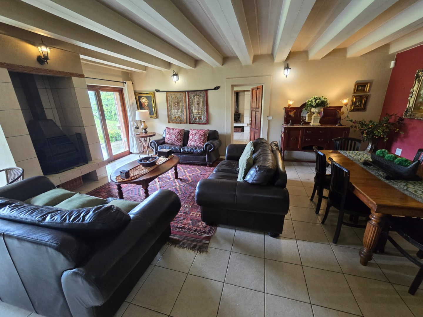 Step inside to discover a thoughtfully designed interior that boasts two spacious open-plan lounges and two distinct dining areas, providing ample room for both relaxation and entertaining. The rustic charm is evident in the exposed ceiling beams and a prominent fireplace, which serves as a focal point in one of the living spaces. While the decor leans towards a traditional aesthetic with solid wood furniture and comfortable leather seating, the layout offers flexibility for personal touches. Tiled flooring extends throughout these communal areas, ensuring durability and ease of maintenance.
