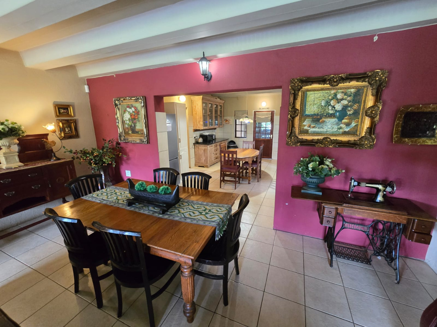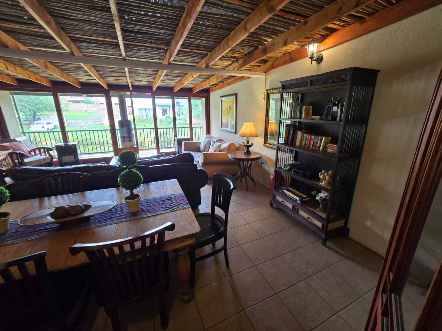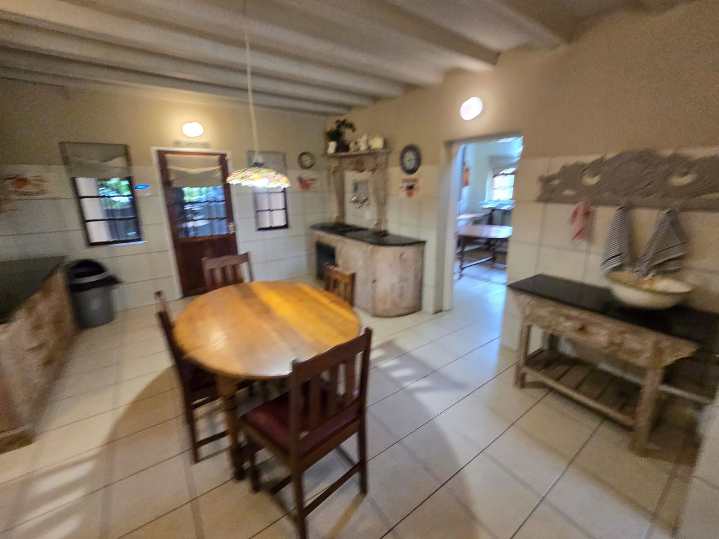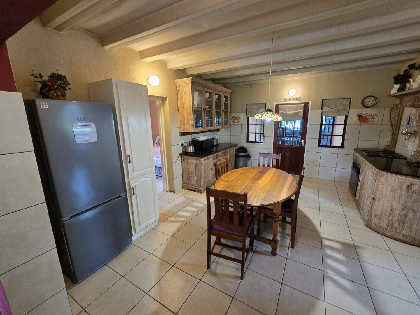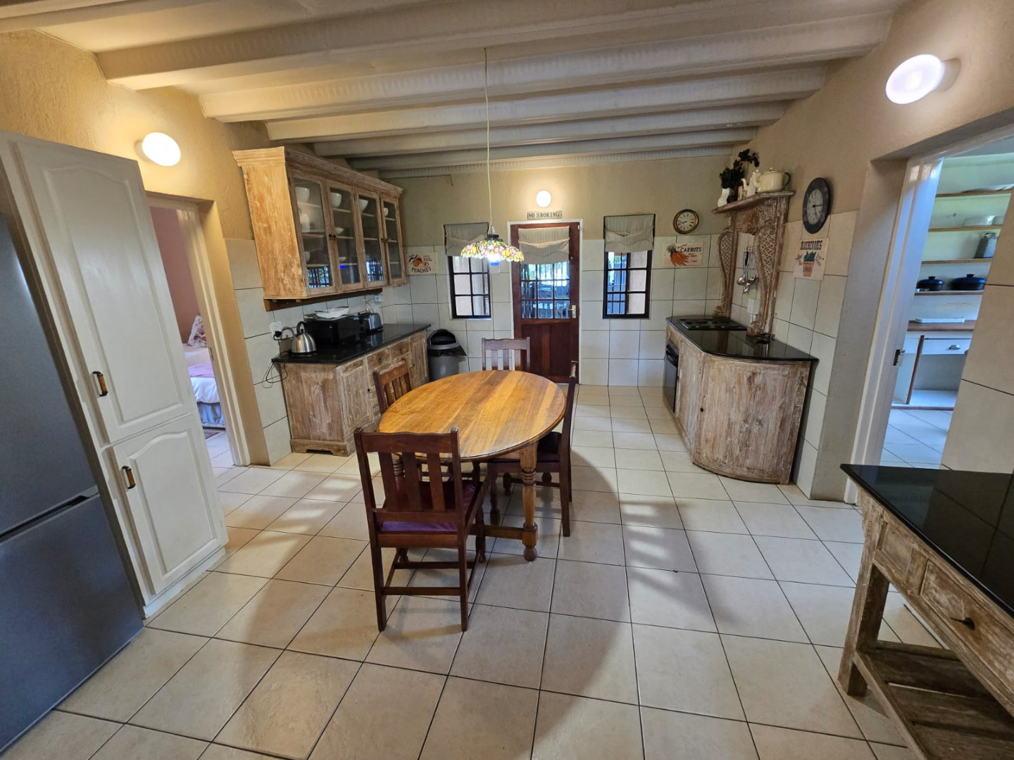 Step inside to discover a thoughtfully designed interior that boasts two spacious open-plan lounges and two distinct dining areas, providing ample room for both relaxation and entertaining. The rustic charm is evident in the exposed ceiling beams and a prominent fireplace, which serves as a focal point in one of the living spaces. While the decor leans towards a traditional aesthetic with solid wood furniture and comfortable leather seating, the layout offers flexibility for personal touches. Tiled flooring extends throughout these communal areas, ensuring durability and ease of maintenance.