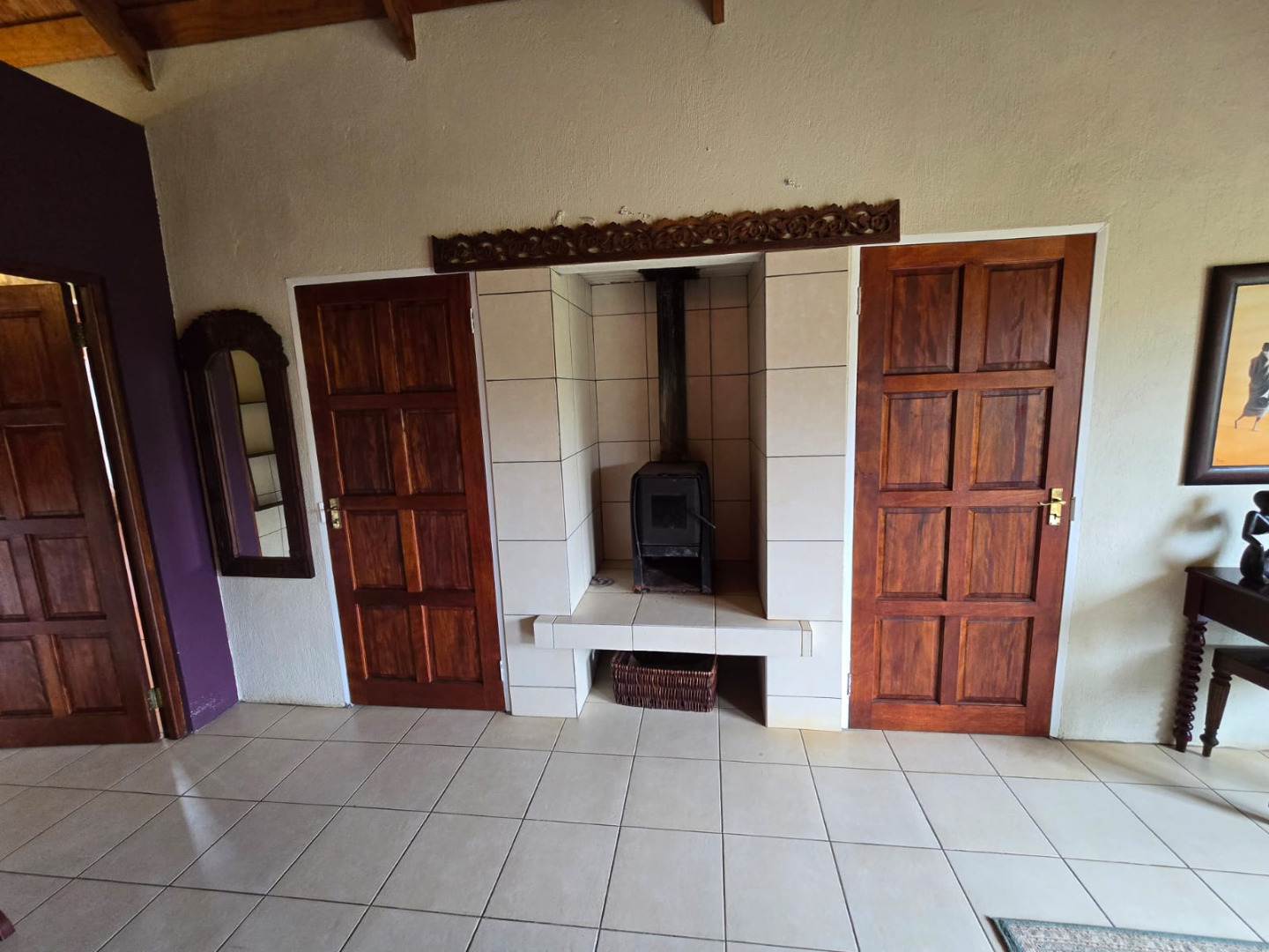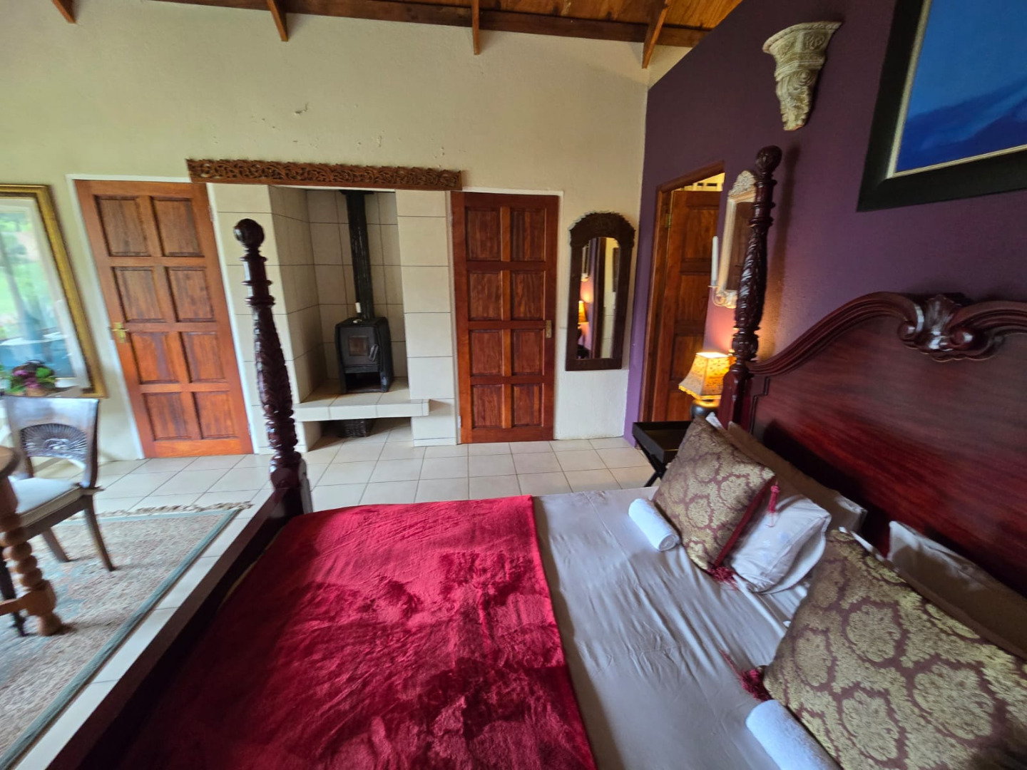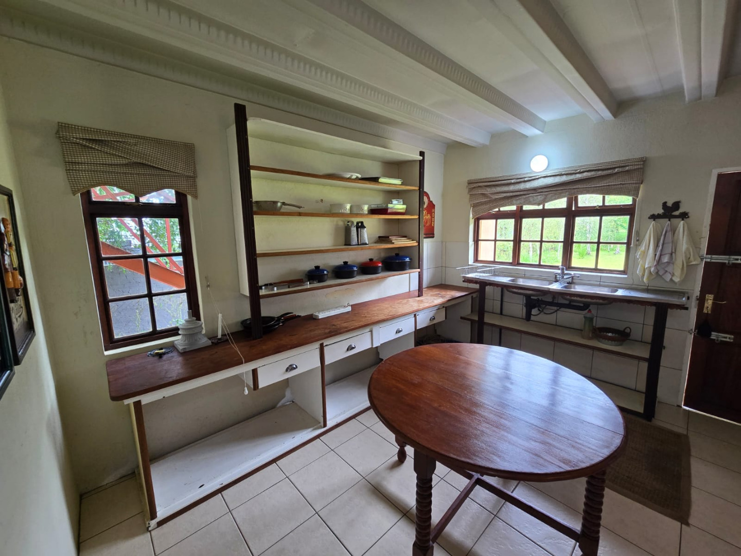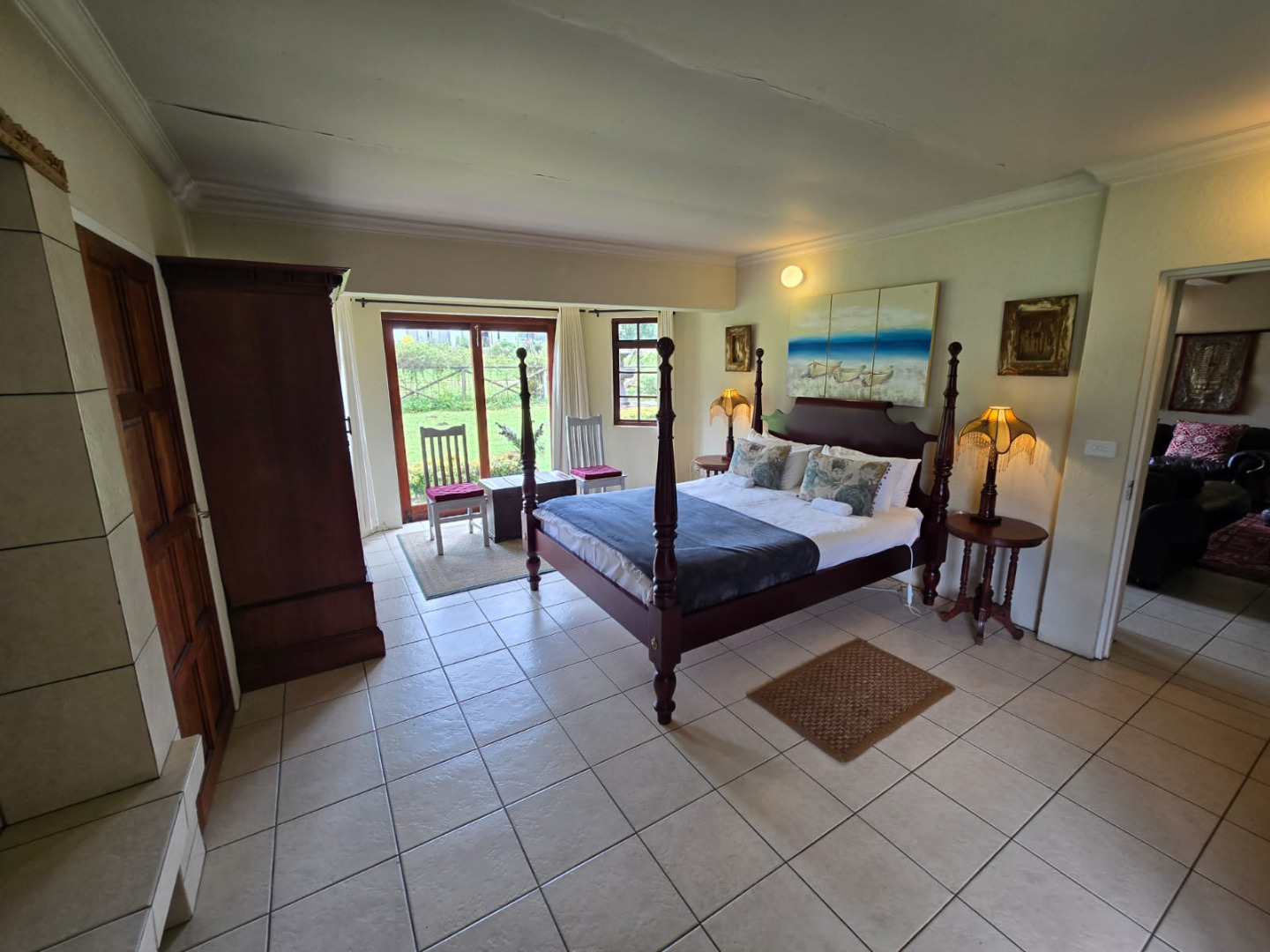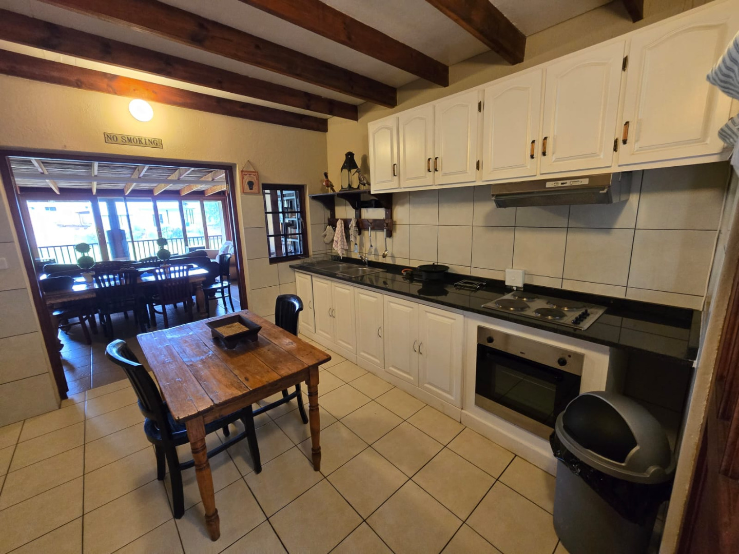 Step inside to discover a thoughtfully designed interior that boasts two spacious open-plan lounges and two distinct dining areas, providing ample room for both relaxation and entertaining. The rustic charm is evident in the exposed ceiling beams and a prominent fireplace, which serves as a focal point in one of the living spaces. While the decor leans towards a traditional aesthetic with solid wood furniture and comfortable leather seating, the layout offers flexibility for personal touches. Tiled flooring extends throughout these communal areas, ensuring durability and ease of maintenance.