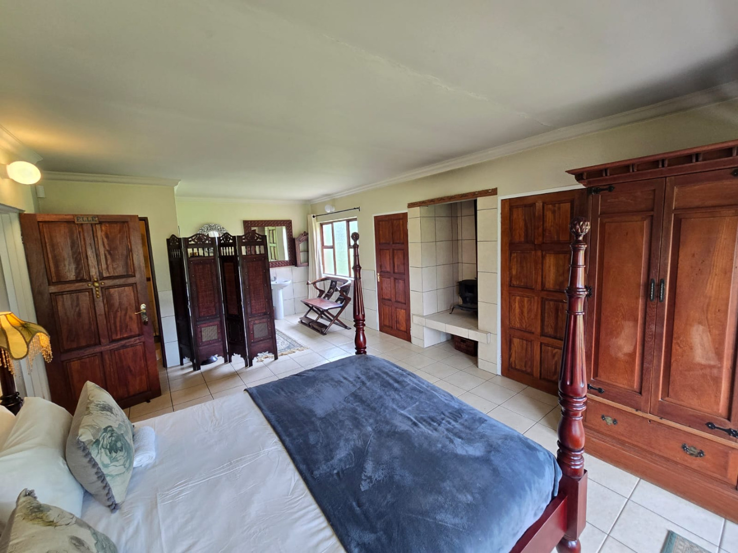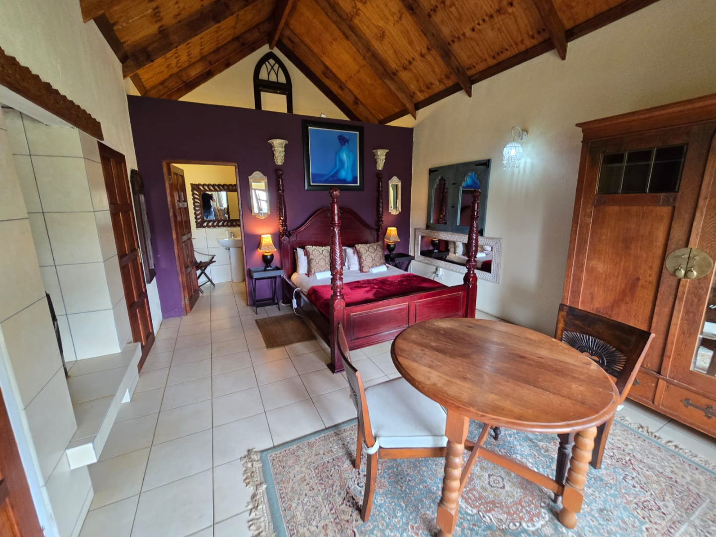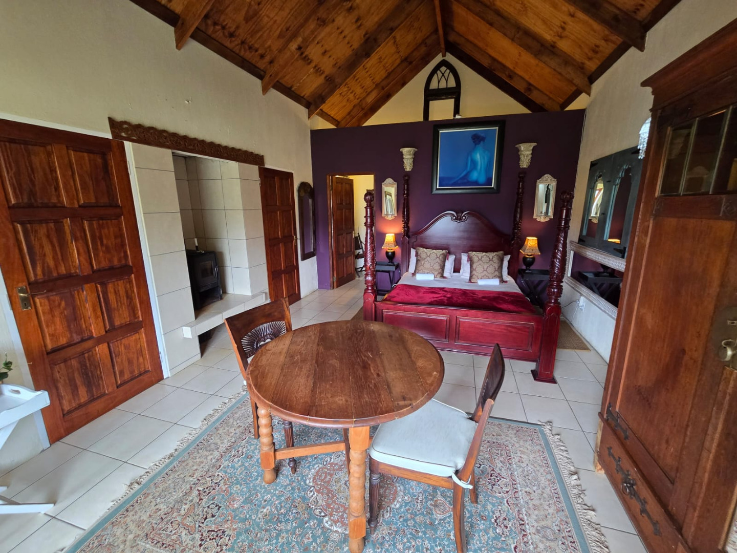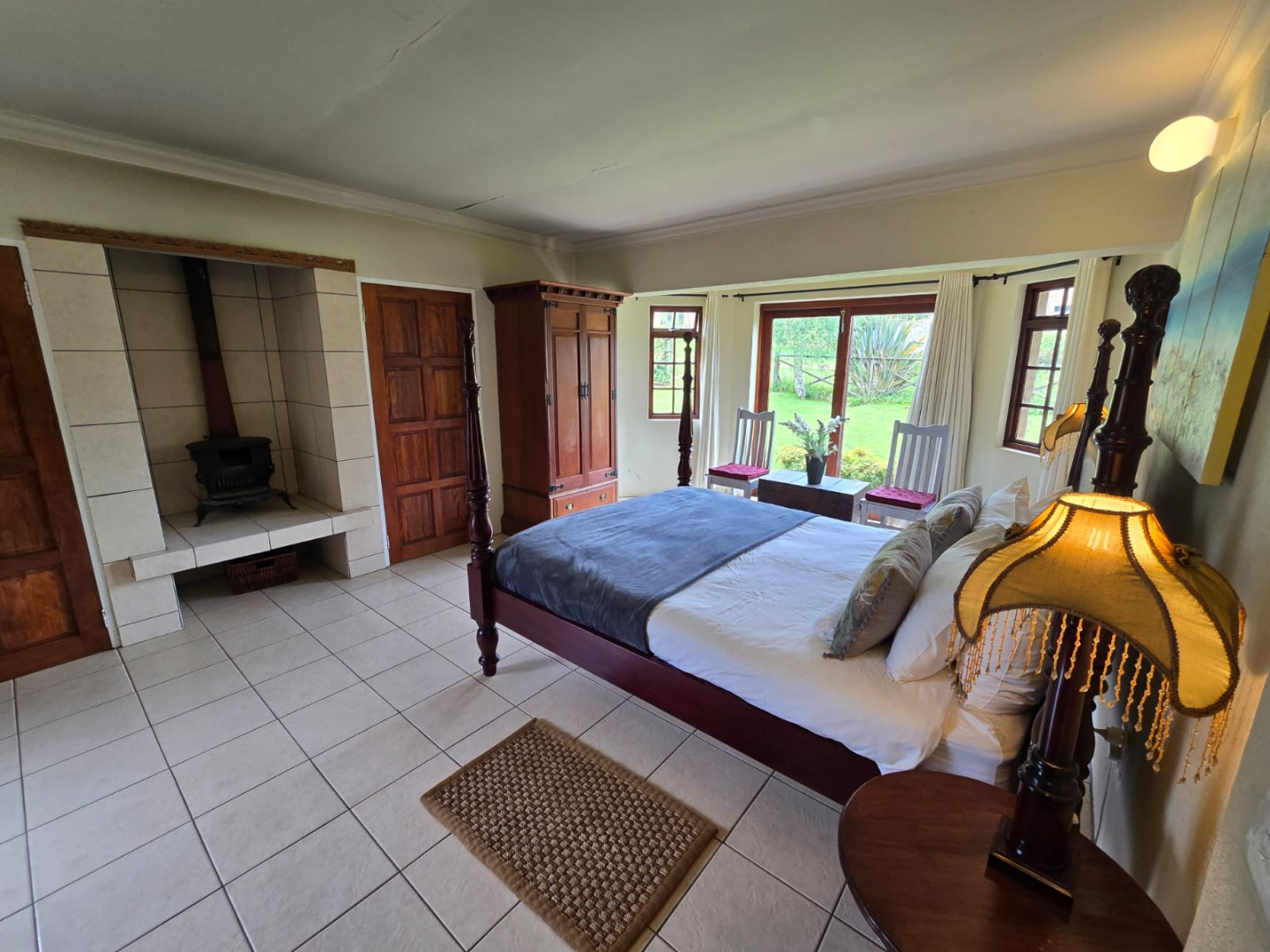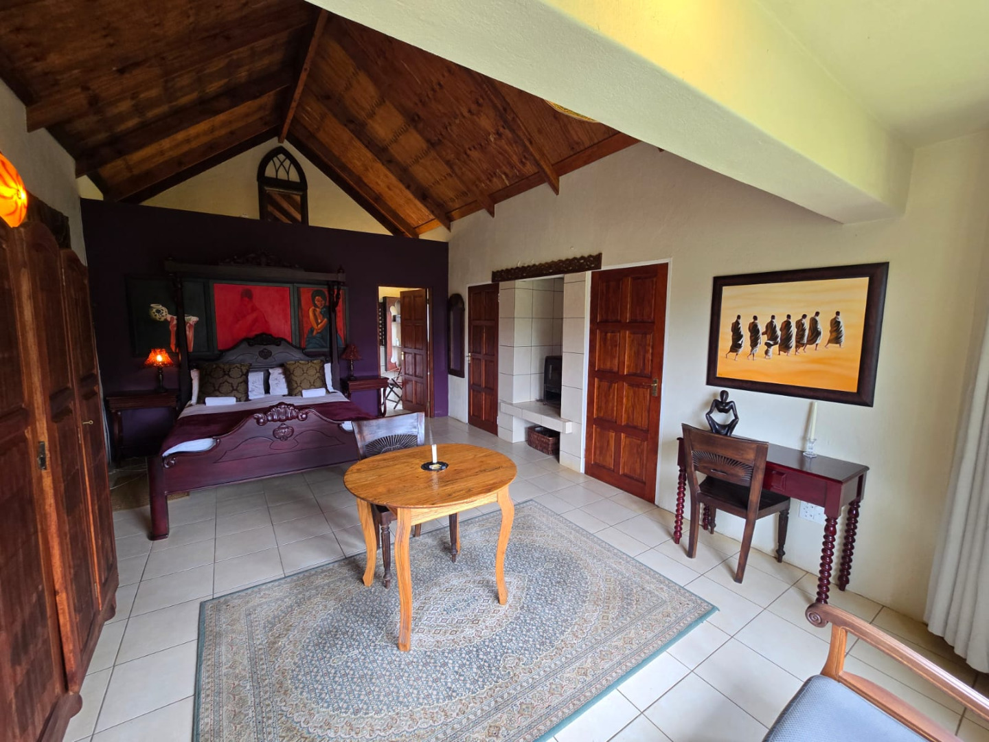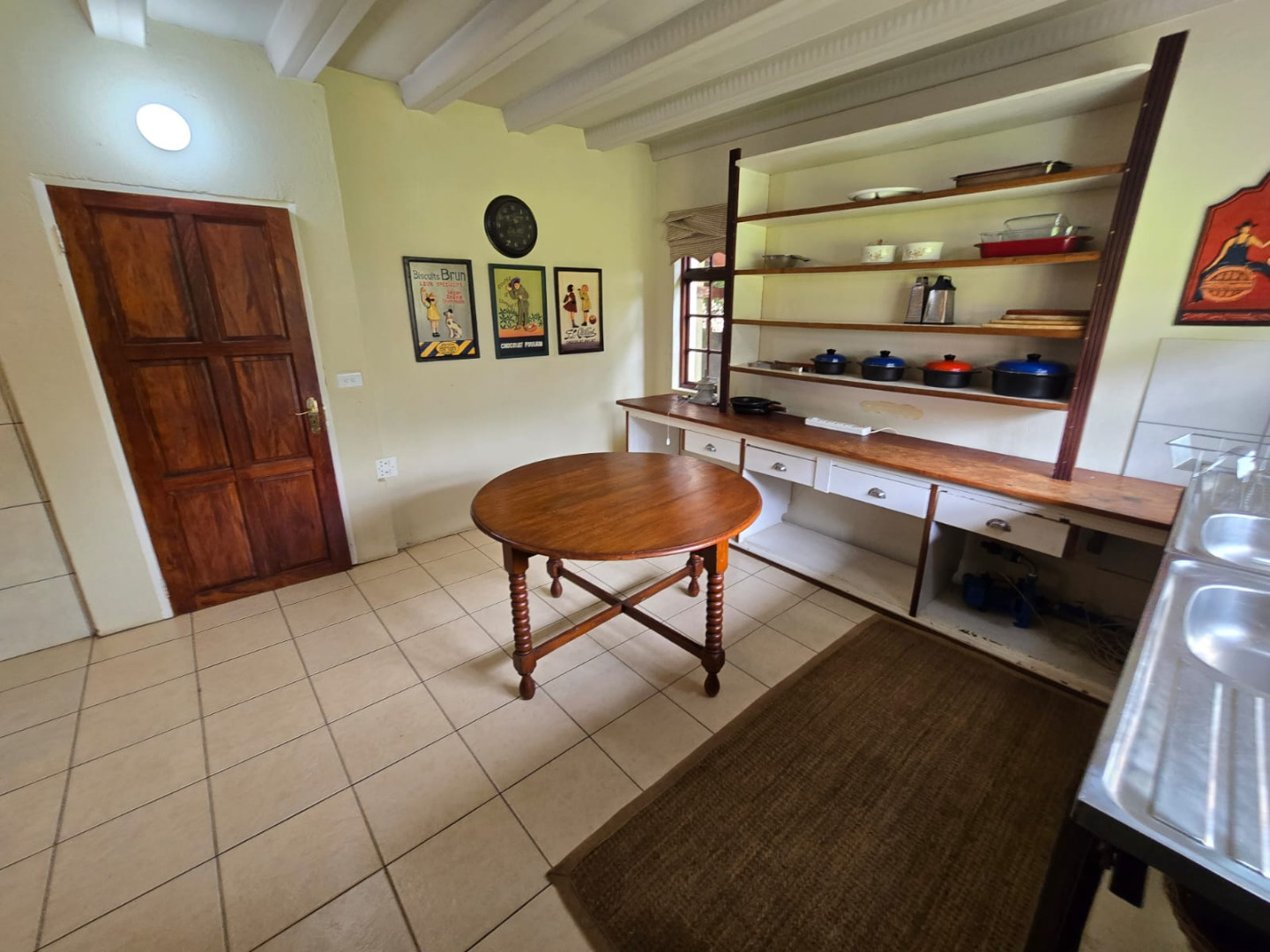 Step inside to discover a thoughtfully designed interior that boasts two spacious open-plan lounges and two distinct dining areas, providing ample room for both relaxation and entertaining. The rustic charm is evident in the exposed ceiling beams and a prominent fireplace, which serves as a focal point in one of the living spaces. While the decor leans towards a traditional aesthetic with solid wood furniture and comfortable leather seating, the layout offers flexibility for personal touches. Tiled flooring extends throughout these communal areas, ensuring durability and ease of maintenance.