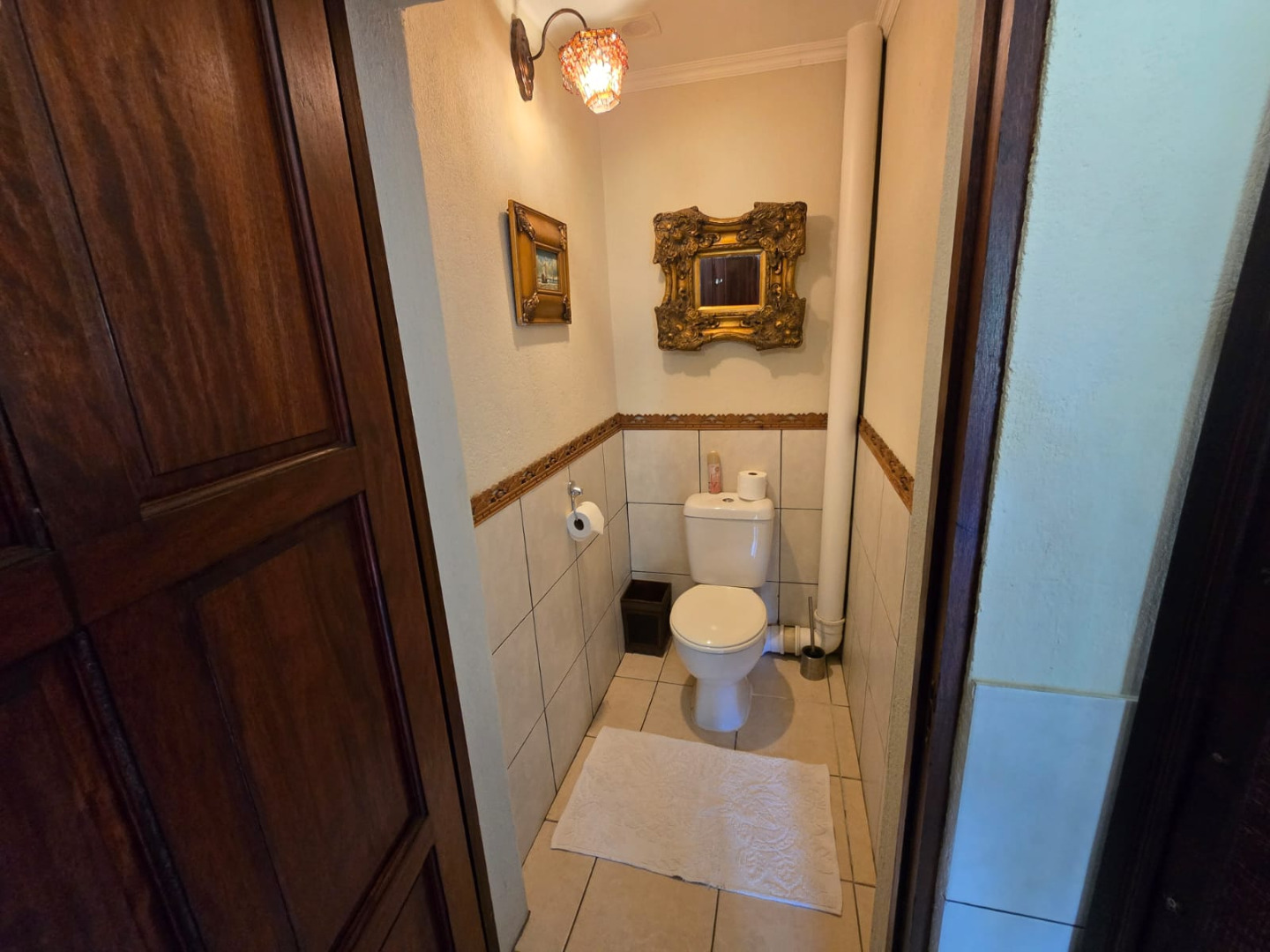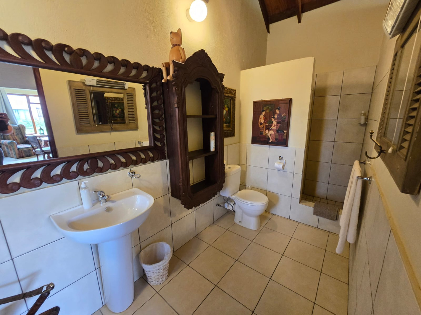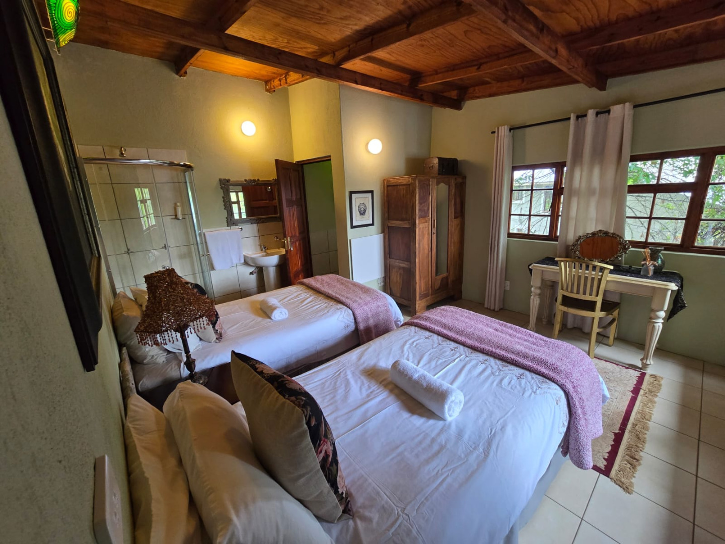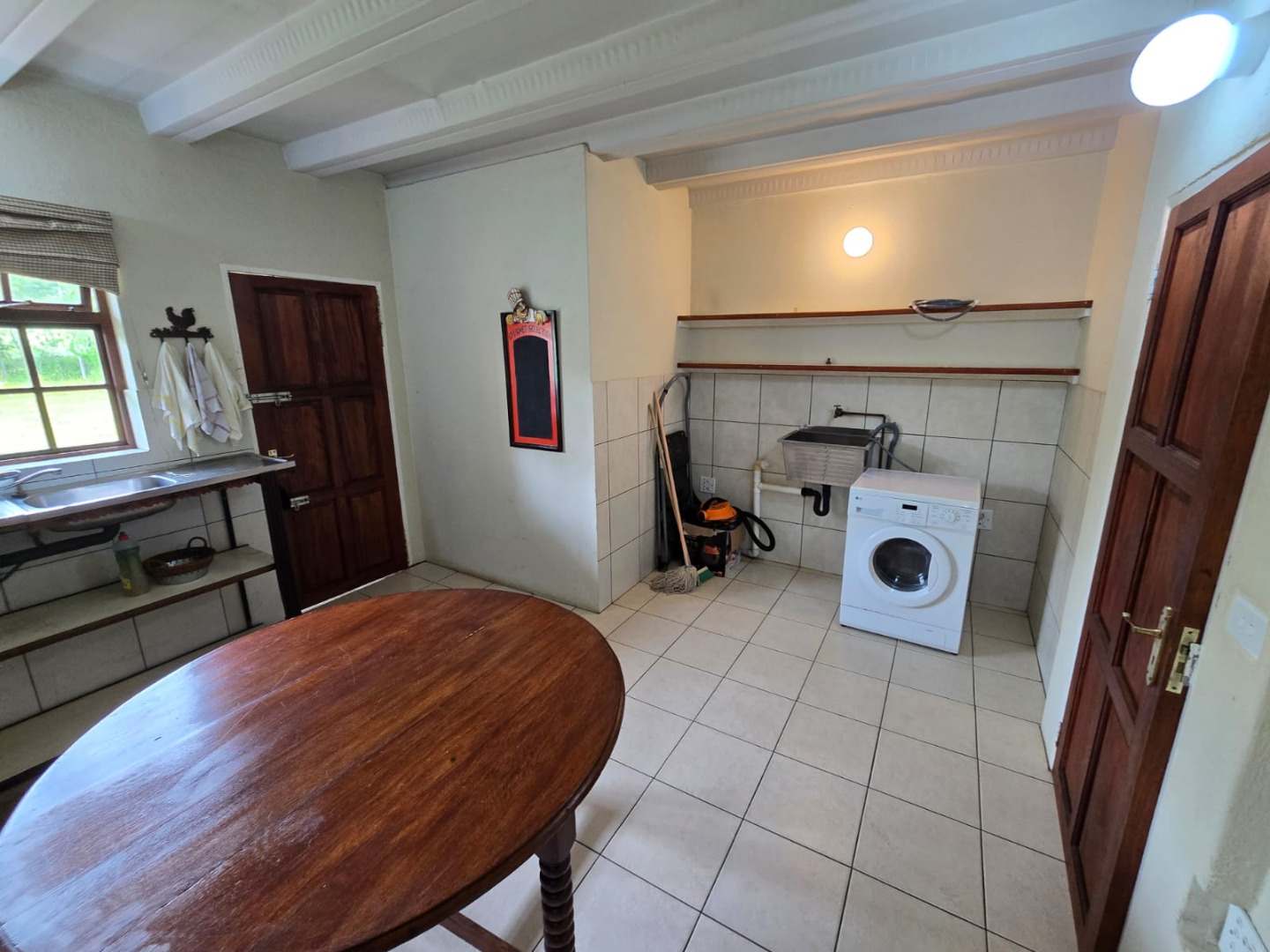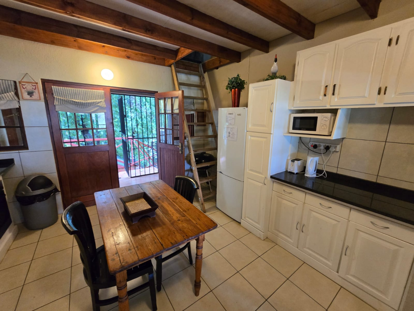 Step inside to discover a thoughtfully designed interior that boasts two spacious open-plan lounges and two distinct dining areas, providing ample room for both relaxation and entertaining. The rustic charm is evident in the exposed ceiling beams and a prominent fireplace, which serves as a focal point in one of the living spaces. While the decor leans towards a traditional aesthetic with solid wood furniture and comfortable leather seating, the layout offers flexibility for personal touches. Tiled flooring extends throughout these communal areas, ensuring durability and ease of maintenance.