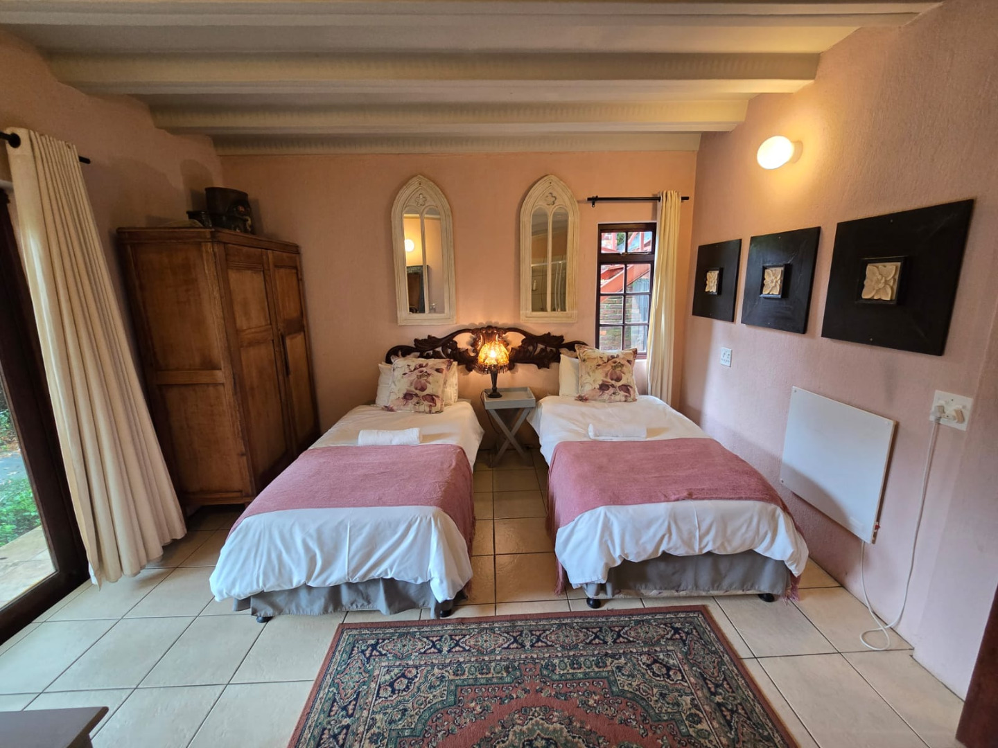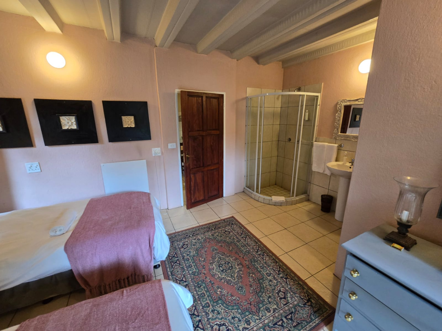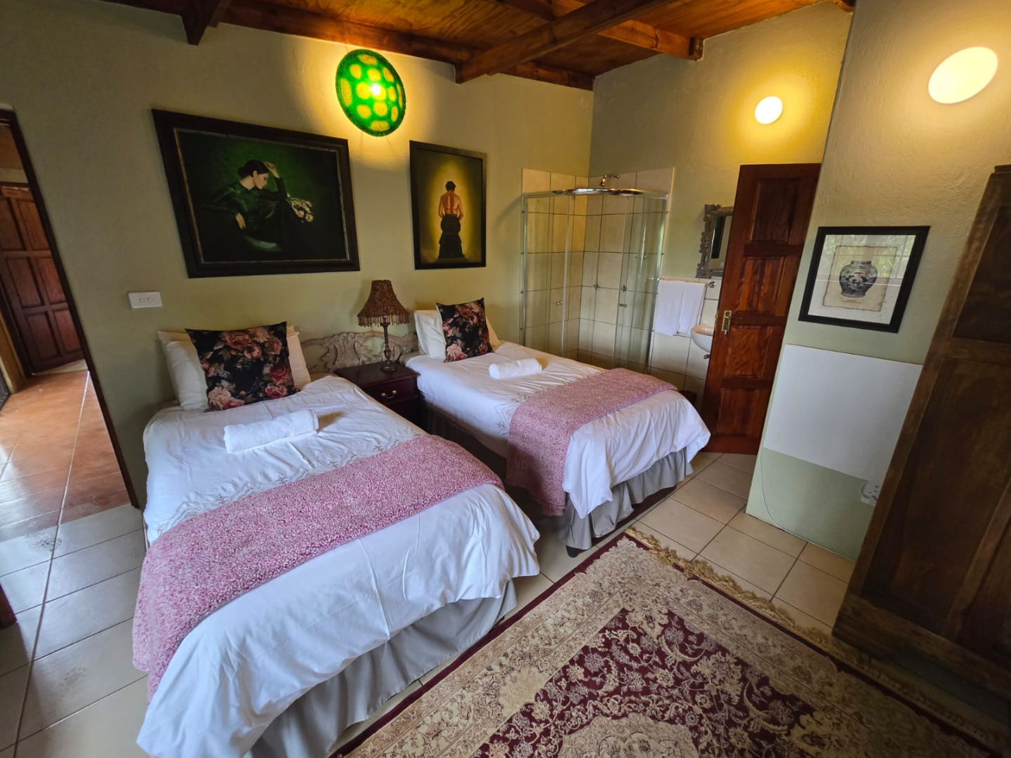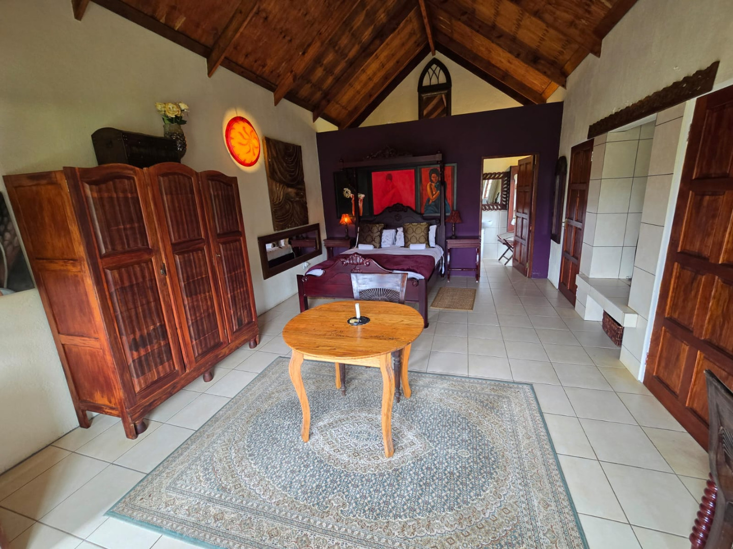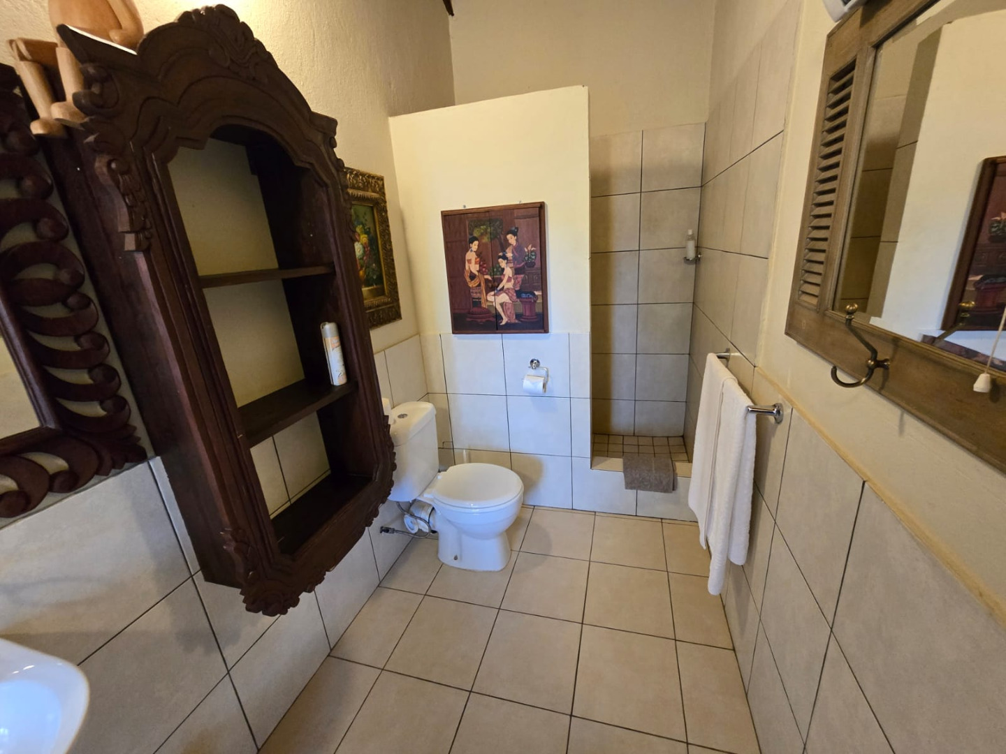 Step inside to discover a thoughtfully designed interior that boasts two spacious open-plan lounges and two distinct dining areas, providing ample room for both relaxation and entertaining. The rustic charm is evident in the exposed ceiling beams and a prominent fireplace, which serves as a focal point in one of the living spaces. While the decor leans towards a traditional aesthetic with solid wood furniture and comfortable leather seating, the layout offers flexibility for personal touches. Tiled flooring extends throughout these communal areas, ensuring durability and ease of maintenance.