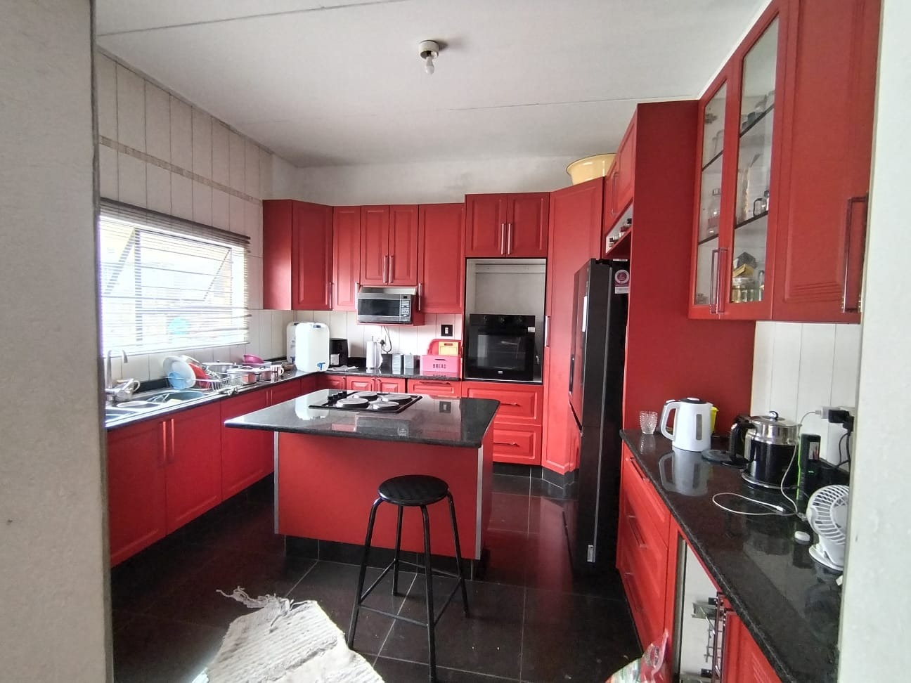 The interior features a versatile layout with five spacious bedrooms and five bathrooms, including four en-suite facilities, ensuring comfort and privacy for all residents. The home is equipped with two kitchens, one showcasing striking red cabinetry, dark granite countertops, a functional island with a hob, and built-in appliances, complemented by a separate dining room and two lounges, perfect for family gatherings and entertaining. Large windows throughout invite natural light, enhancing the bright and airy atmosphere.