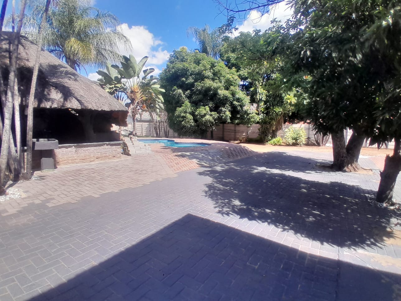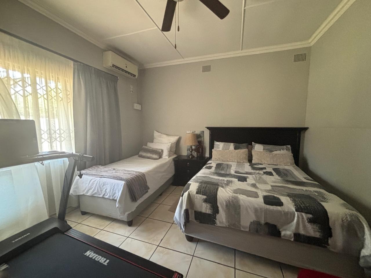 Accommodation comprises of four comfortable bedrooms with ample natural light and air-conditioning system for optimal comfort., with two benefiting from private en-suite bathrooms, alongside a convenient guest toilet. The property's outdoor amenities are equally impressive, centered around a large, clean kidney-shaped swimming pool surrounded by attractive red brick paving, perfect for leisure and entertaining. A Lapa and built-in braai further enhance the outdoor living experience, all set within a well-maintained garden featuring an irrigation system and a pressured pump water tank for self sufficient water supply.