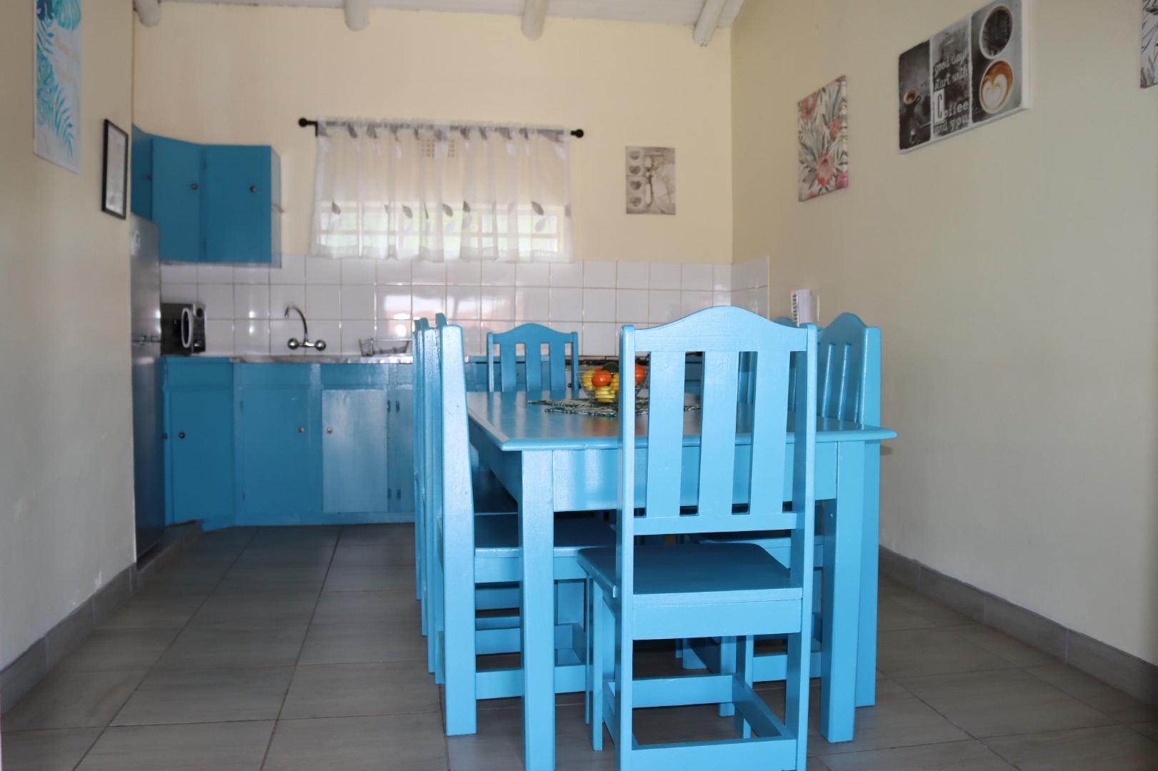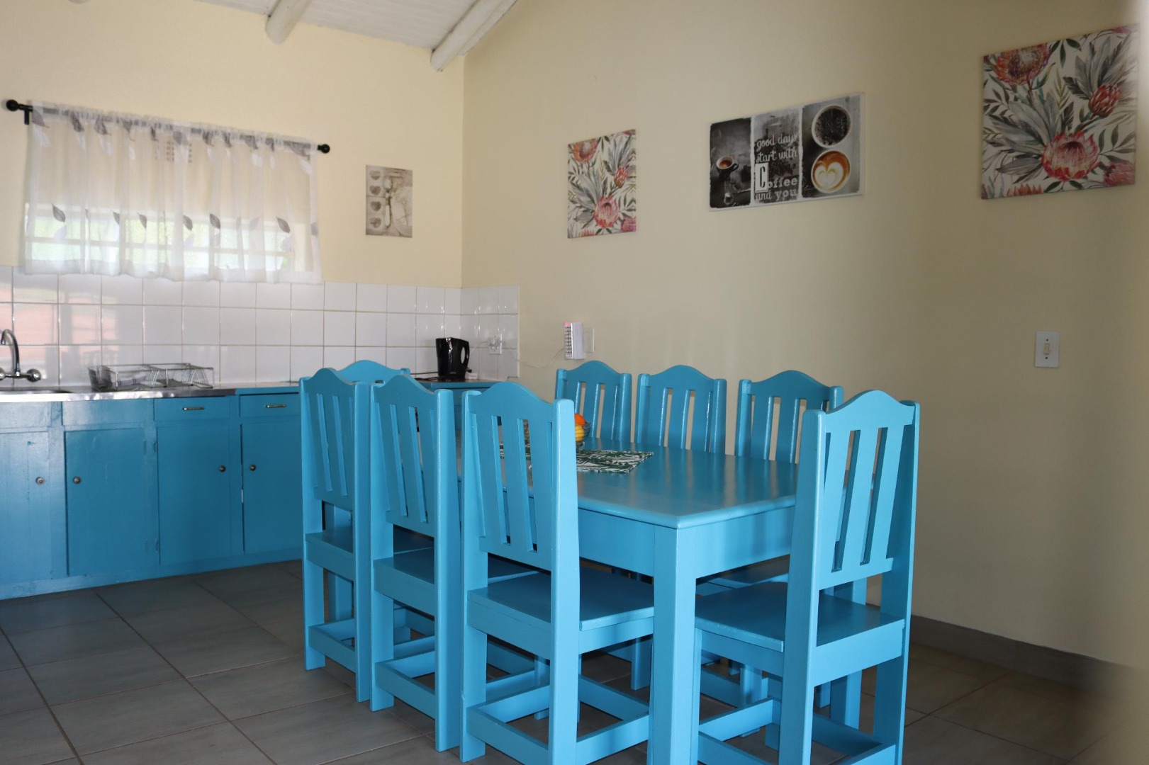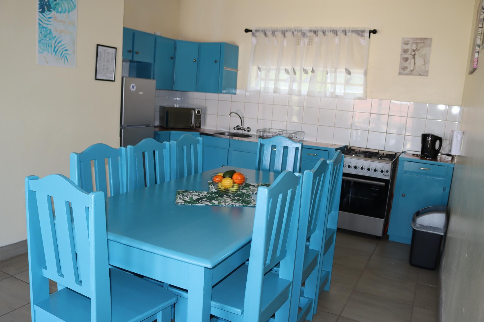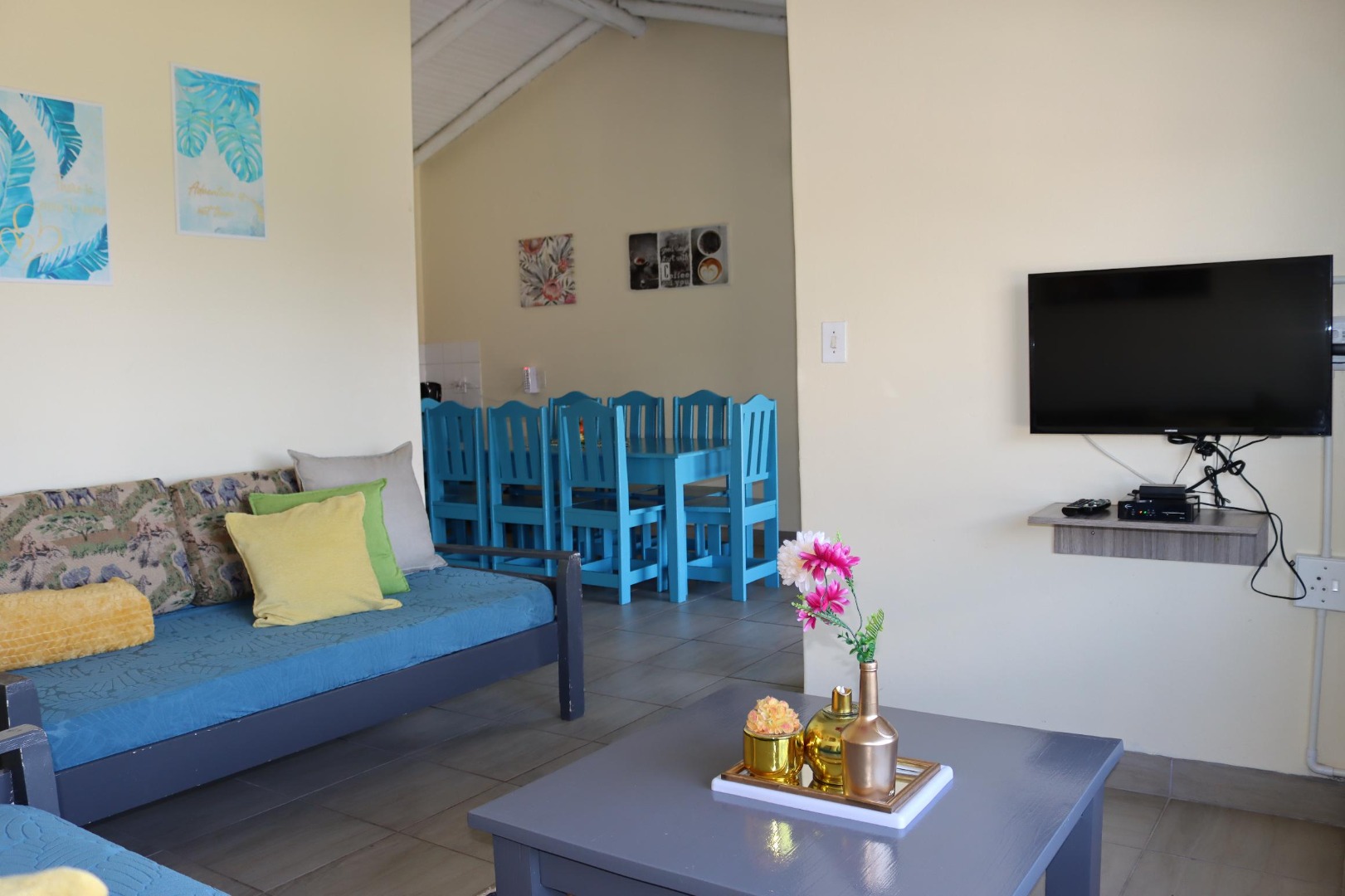 Inside, the 97 sqm floor plan features a bright and open-plan living area. The functional kitchen boasts a distinctive blue colour scheme for its cabinets, alongside tiled flooring for easy maintenance. This layout ensures a comfortable flow for daily living and entertaining.