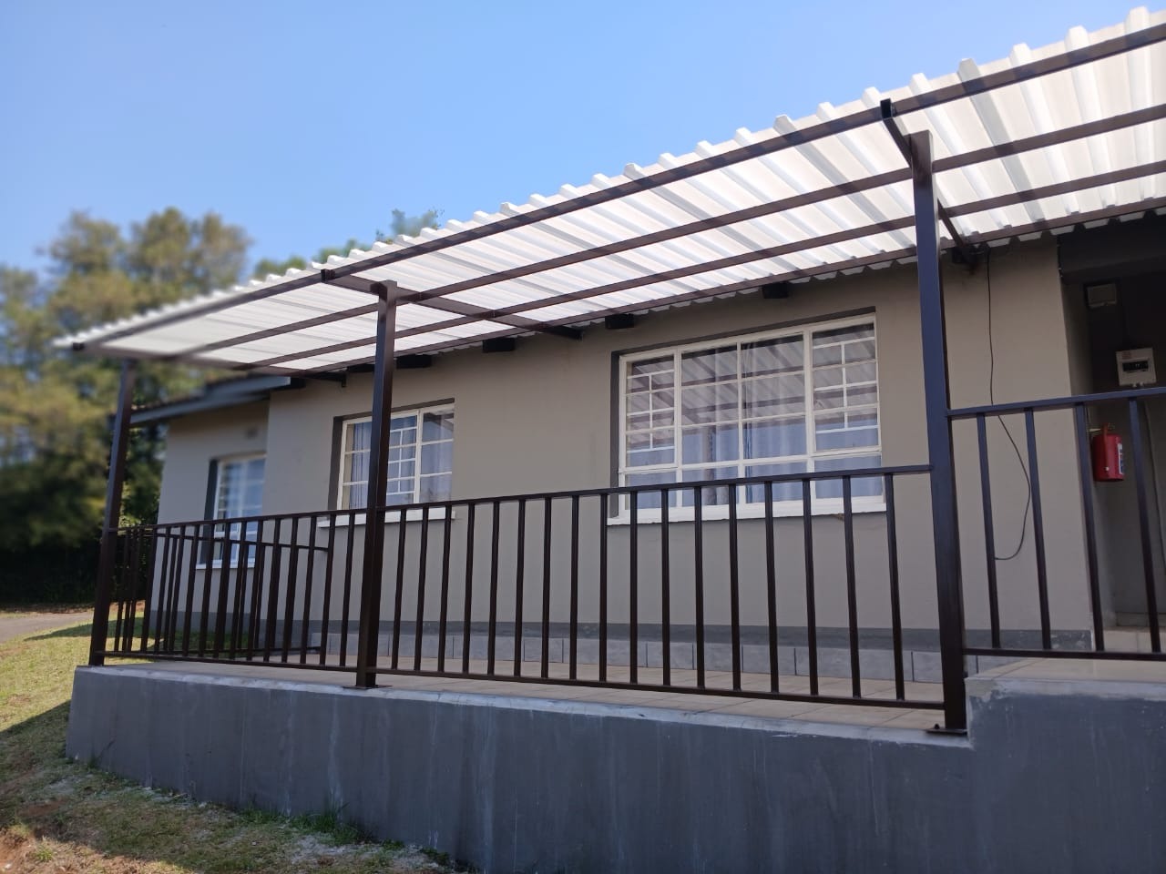 The property presents a modern aesthetic with its dark grey exterior and contrasting red tiled roofs, creating an inviting first impression. An elevated foundation and freshly painted walls contribute to its well-maintained features.