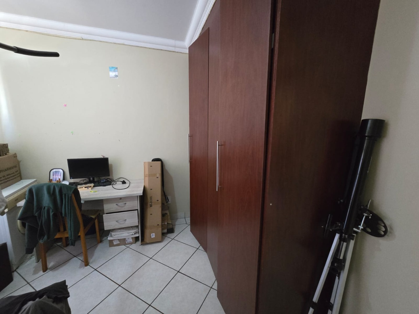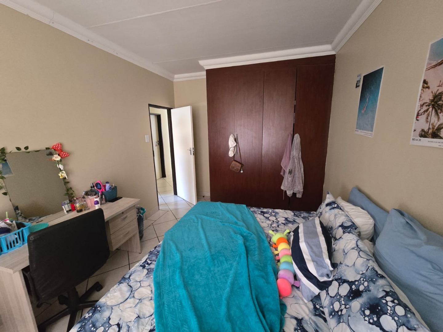The three well-proportioned bedrooms offer comfortable retreats, each featuring tiled flooring and natural light. The main bedroom benefits from an en-suite bathroom, one of two full bathrooms in the home. Built-in dark wood wardrobes in at least one bedroom provide extensive storage solutions, maintaining a tidy and organized space.