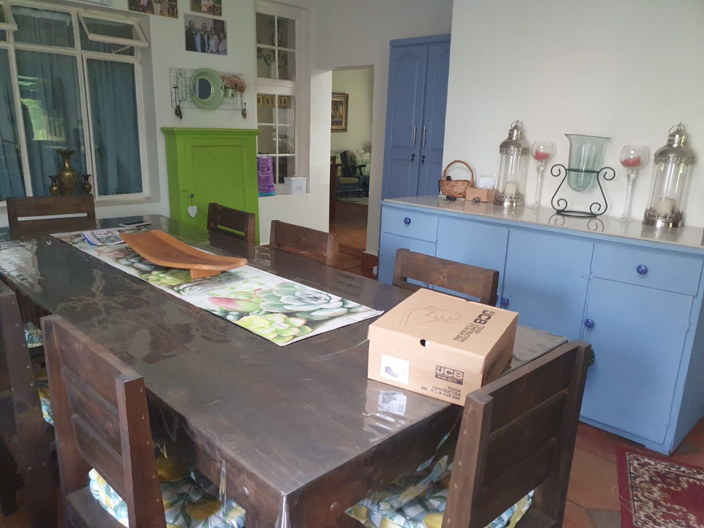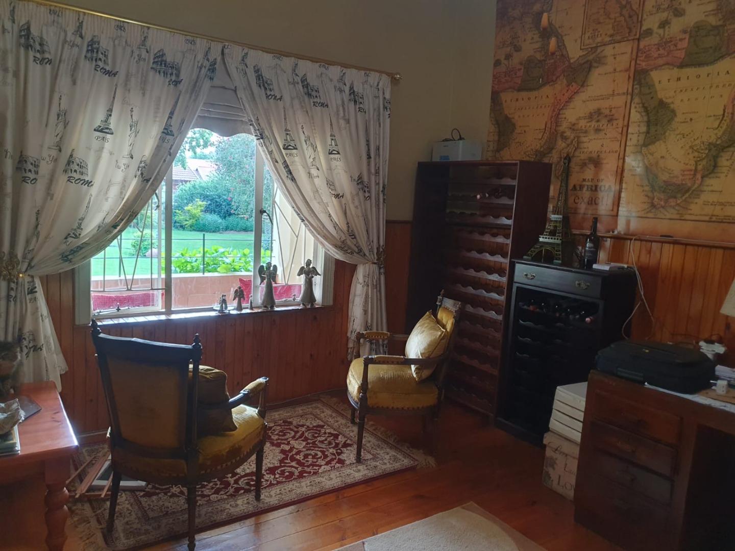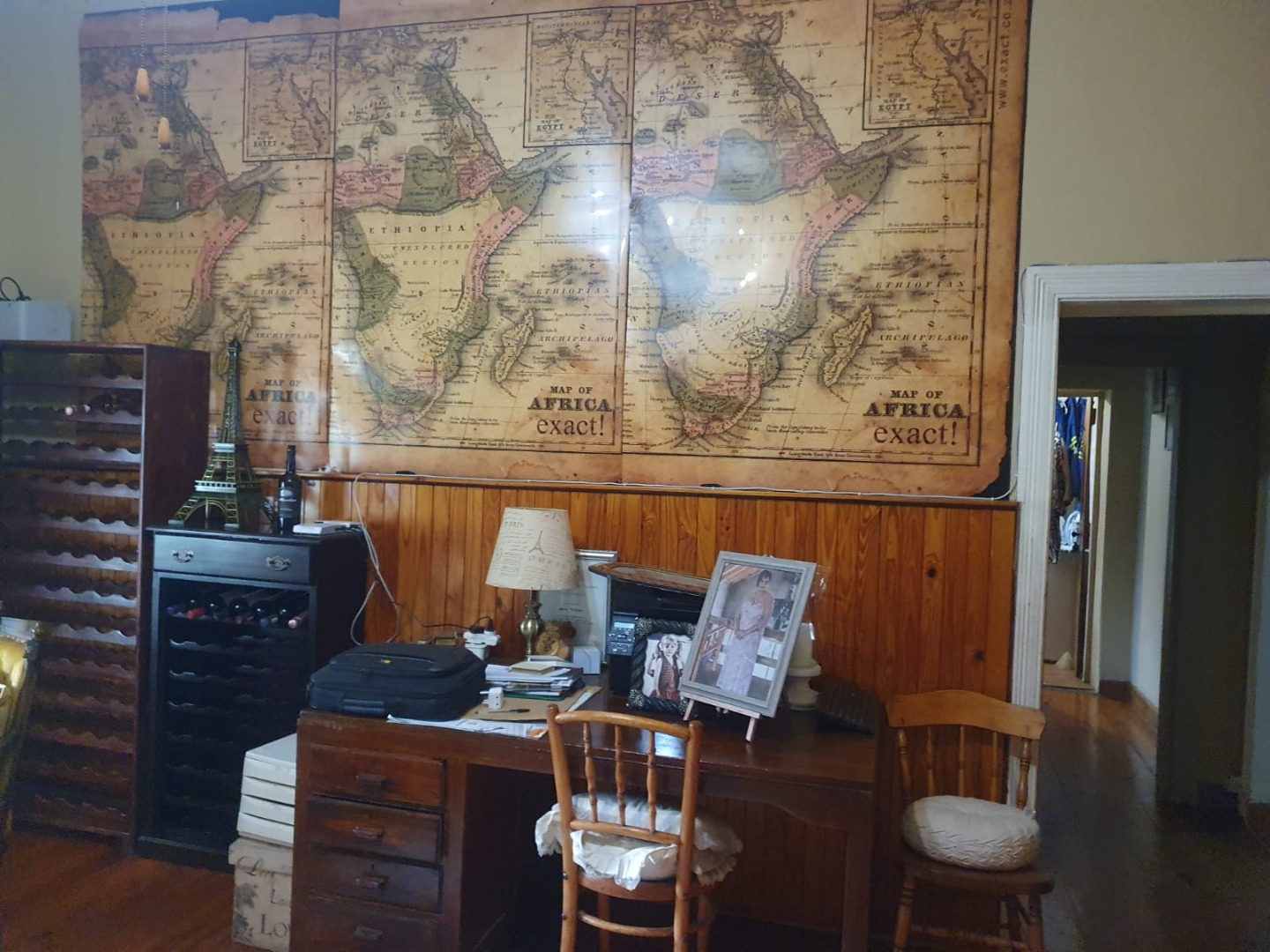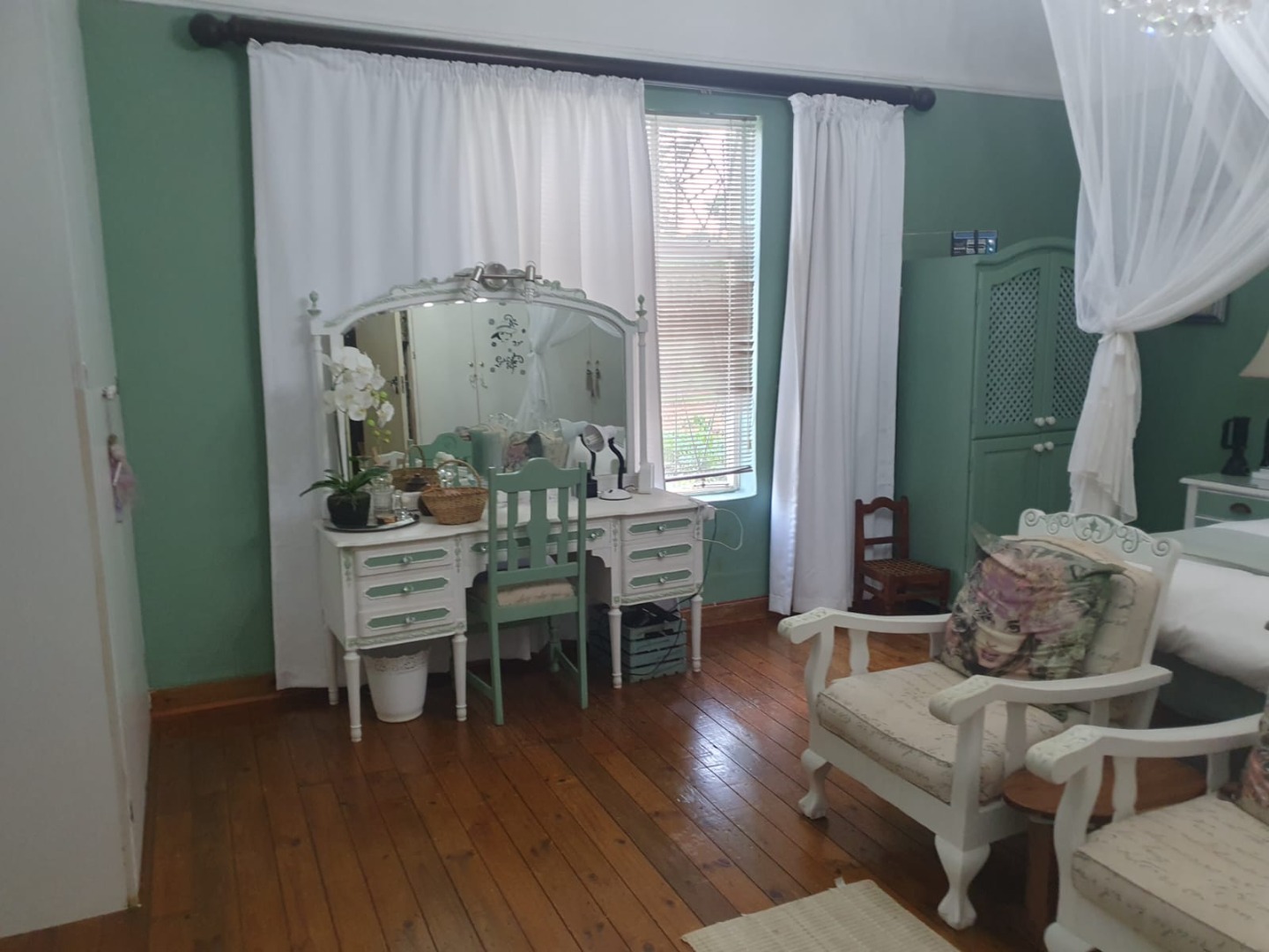 The second house on the property is equally charming. The bright and airy dining room is filled with natural light, complemented by sleek tiles throughout the space. The kitchen includes a gas stove and double oven, ideal for anyone who enjoys cooking. A lovely sunroom provides a peaceful retreat, while the second dining room features a coal oven, adding warmth and character to the space. The main bedroom offers built-in cupboards and an en-suite bathroom with his-and-hers basins, a corner bath, and a shower, creating a luxurious environment. The first guest bedroom has wooden floors and built-in cupboards, and the third bedroom is equipped with a ceiling fan for added comfort. The study, passage, and main lounge all feature beautiful wooden floors, adding warmth and elegance to the home. The shared guest bathroom includes an extractor fan, a gas geyser (250L), and a bath and shower.
