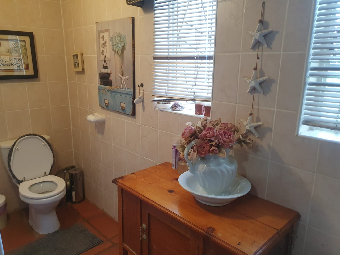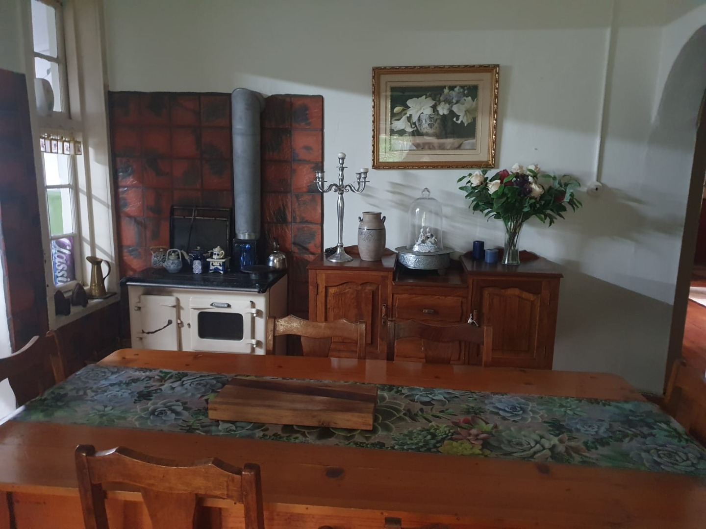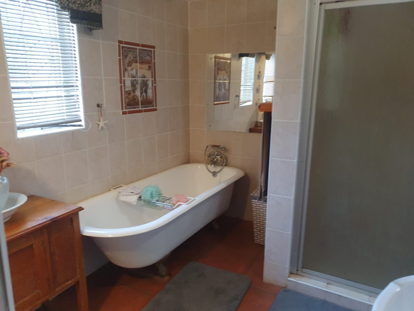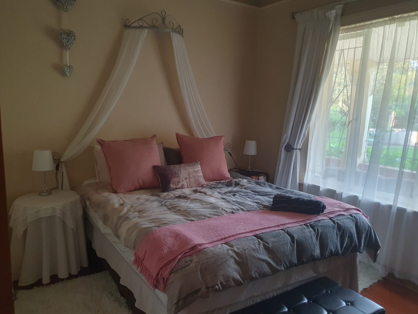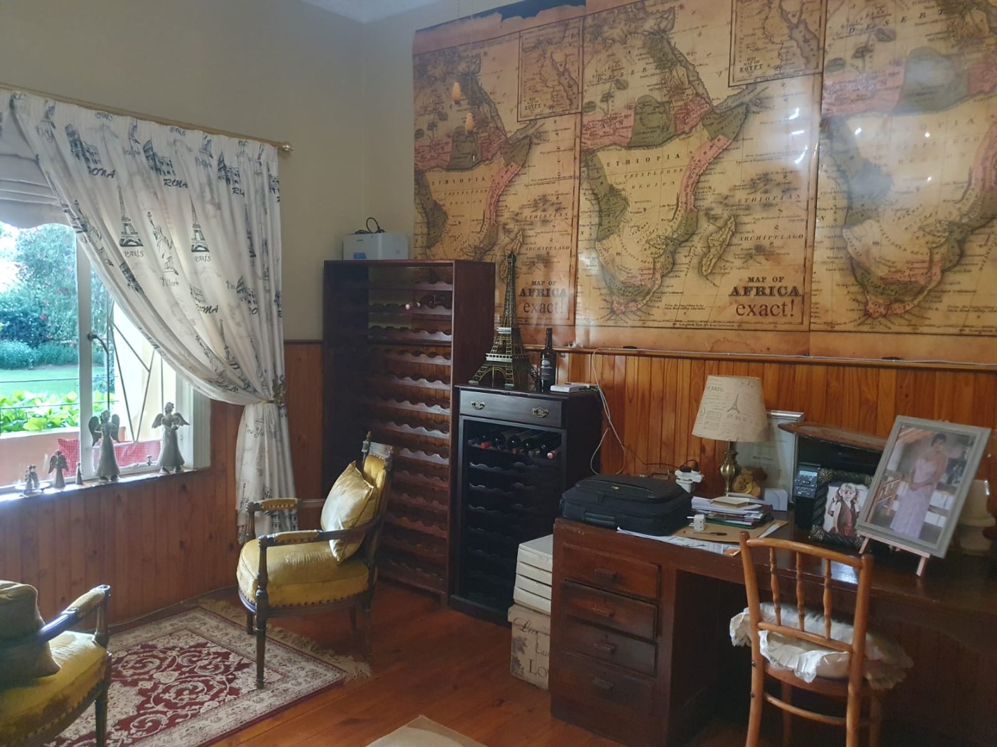 The second house on the property is equally charming. The bright and airy dining room is filled with natural light, complemented by sleek tiles throughout the space. The kitchen includes a gas stove and double oven, ideal for anyone who enjoys cooking. A lovely sunroom provides a peaceful retreat, while the second dining room features a coal oven, adding warmth and character to the space. The main bedroom offers built-in cupboards and an en-suite bathroom with his-and-hers basins, a corner bath, and a shower, creating a luxurious environment. The first guest bedroom has wooden floors and built-in cupboards, and the third bedroom is equipped with a ceiling fan for added comfort. The study, passage, and main lounge all feature beautiful wooden floors, adding warmth and elegance to the home. The shared guest bathroom includes an extractor fan, a gas geyser (250L), and a bath and shower.