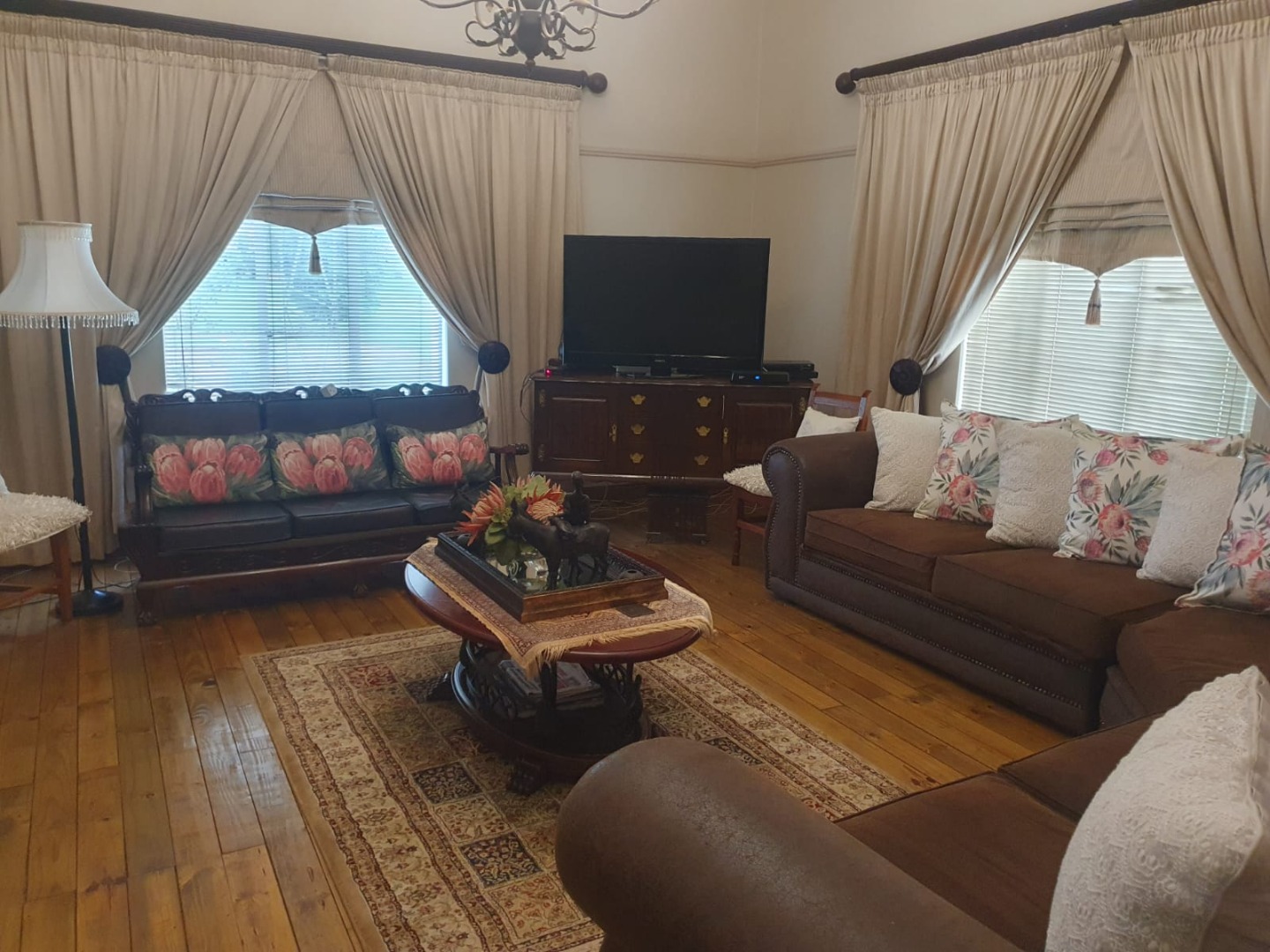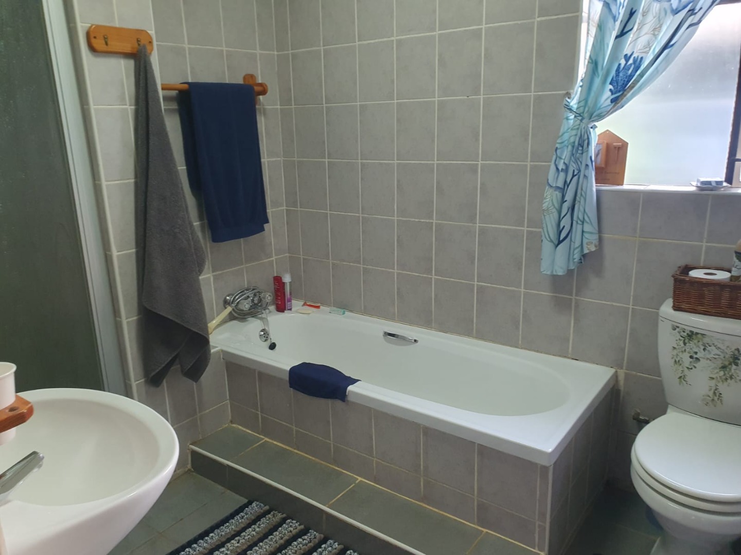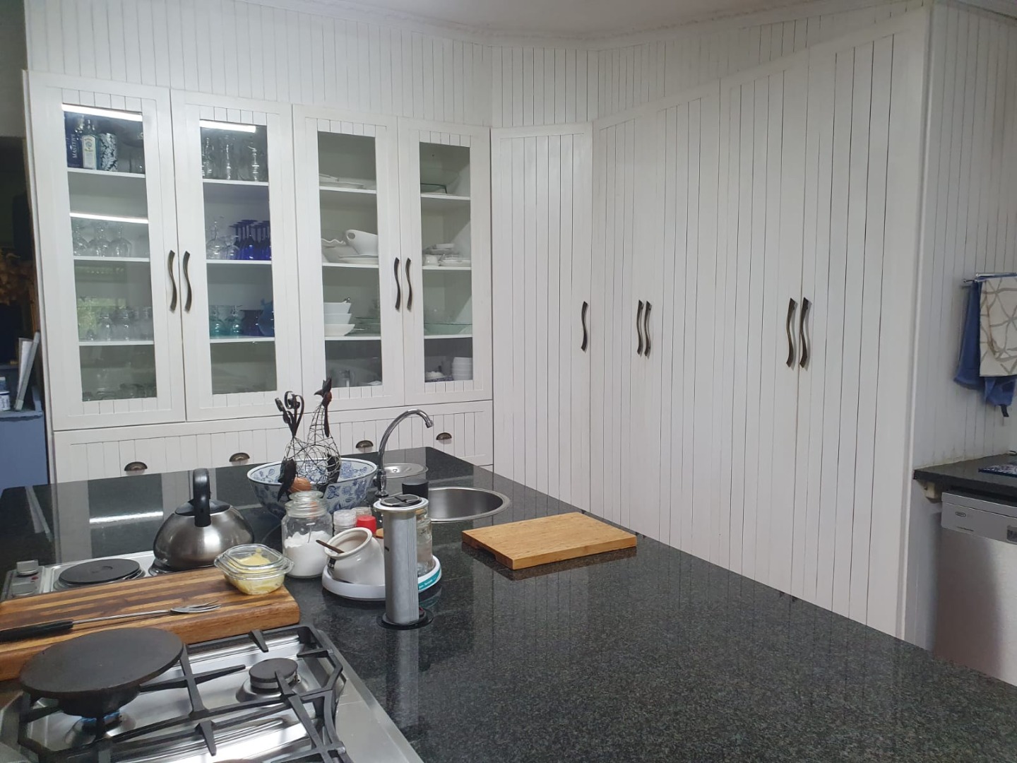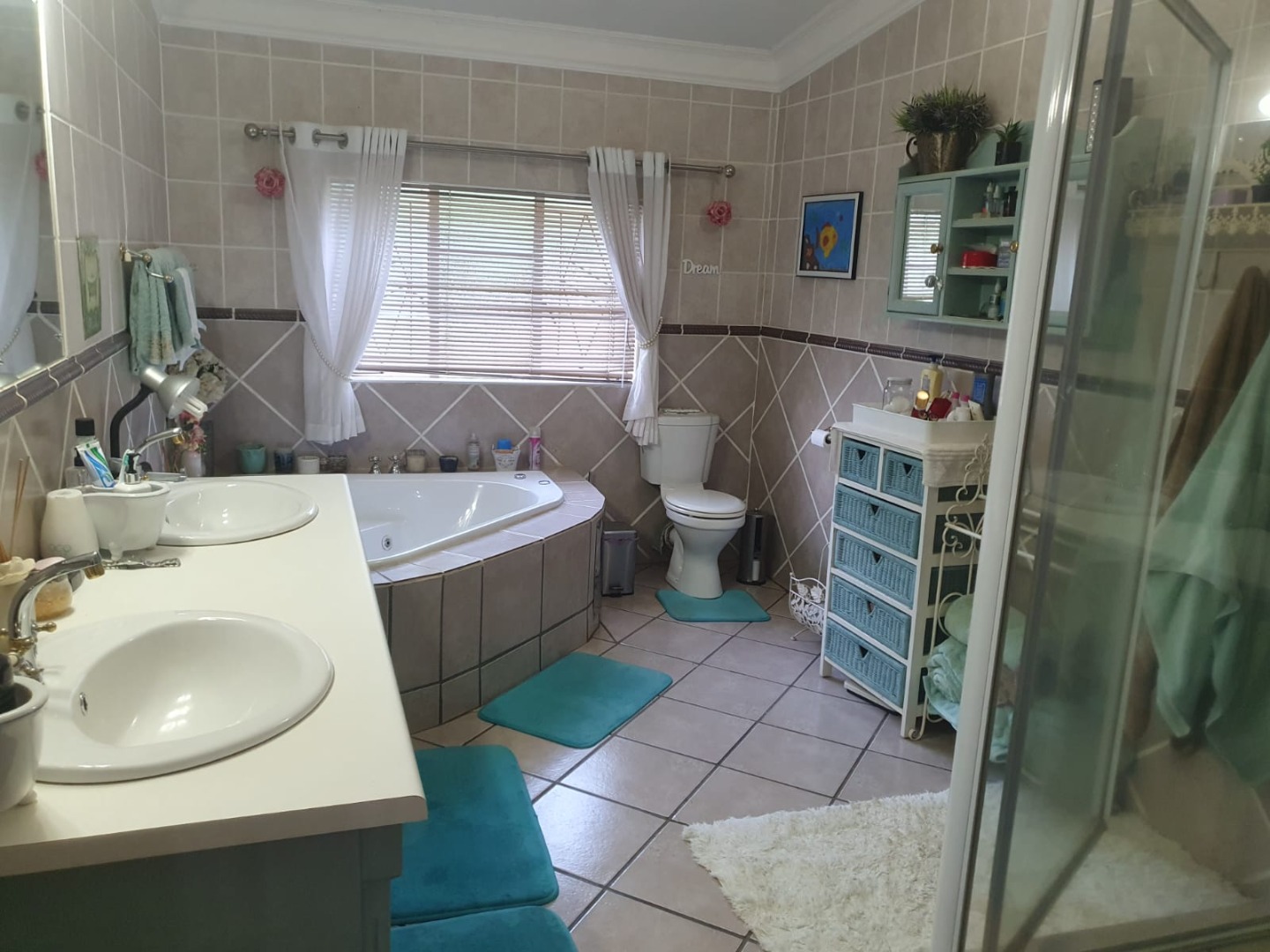 The second house on the property is equally charming. The bright and airy dining room is filled with natural light, complemented by sleek tiles throughout the space. The kitchen includes a gas stove and double oven, ideal for anyone who enjoys cooking. A lovely sunroom provides a peaceful retreat, while the second dining room features a coal oven, adding warmth and character to the space. The main bedroom offers built-in cupboards and an en-suite bathroom with his-and-hers basins, a corner bath, and a shower, creating a luxurious environment. The first guest bedroom has wooden floors and built-in cupboards, and the third bedroom is equipped with a ceiling fan for added comfort. The study, passage, and main lounge all feature beautiful wooden floors, adding warmth and elegance to the home. The shared guest bathroom includes an extractor fan, a gas geyser (250L), and a bath and shower.