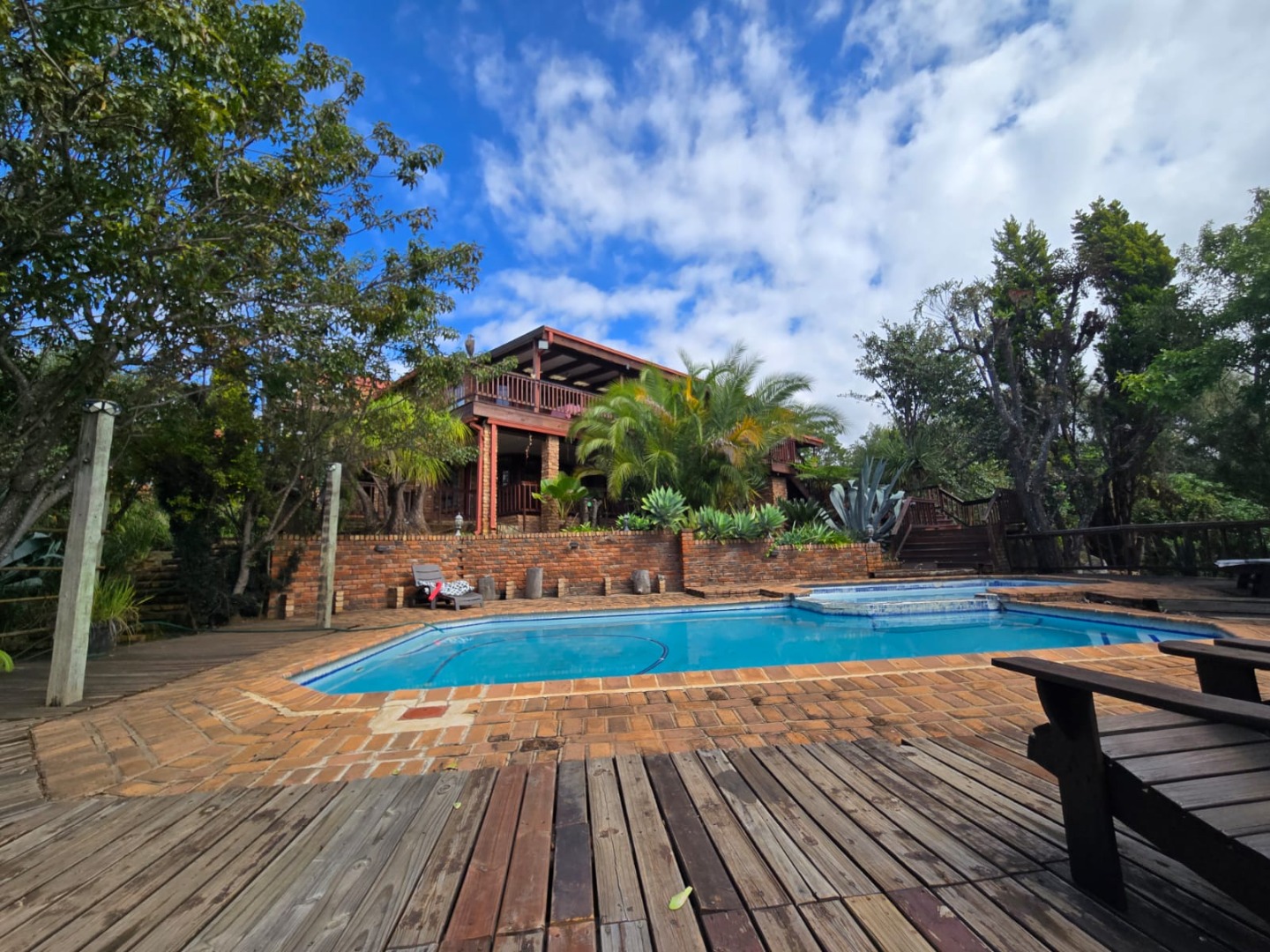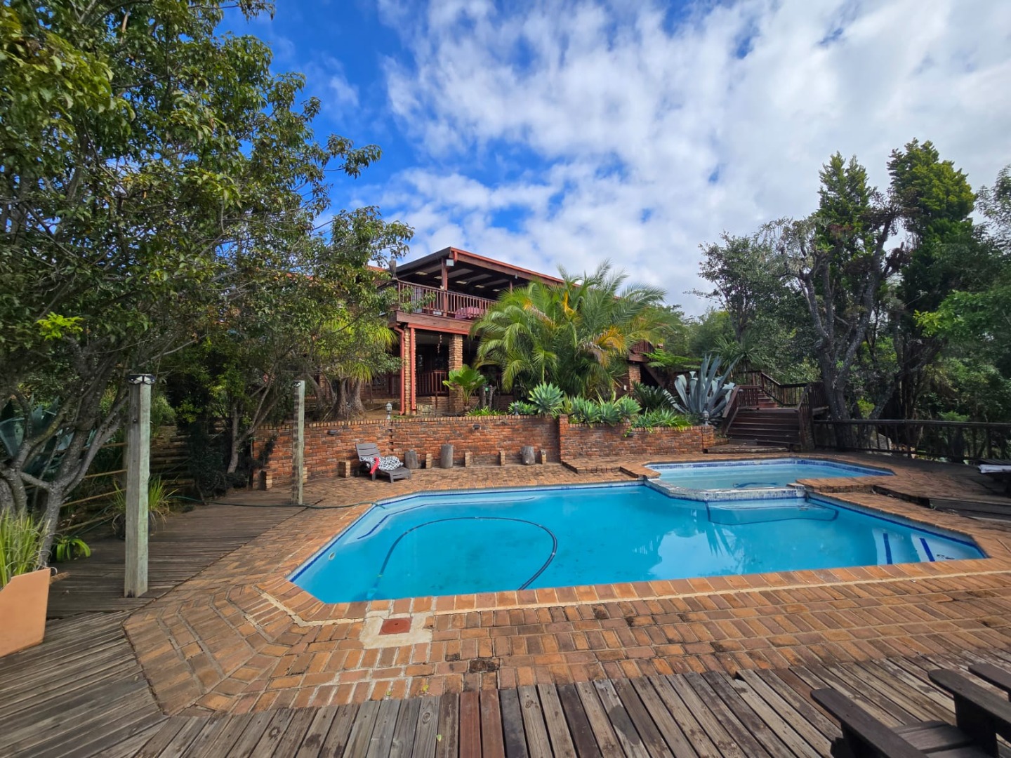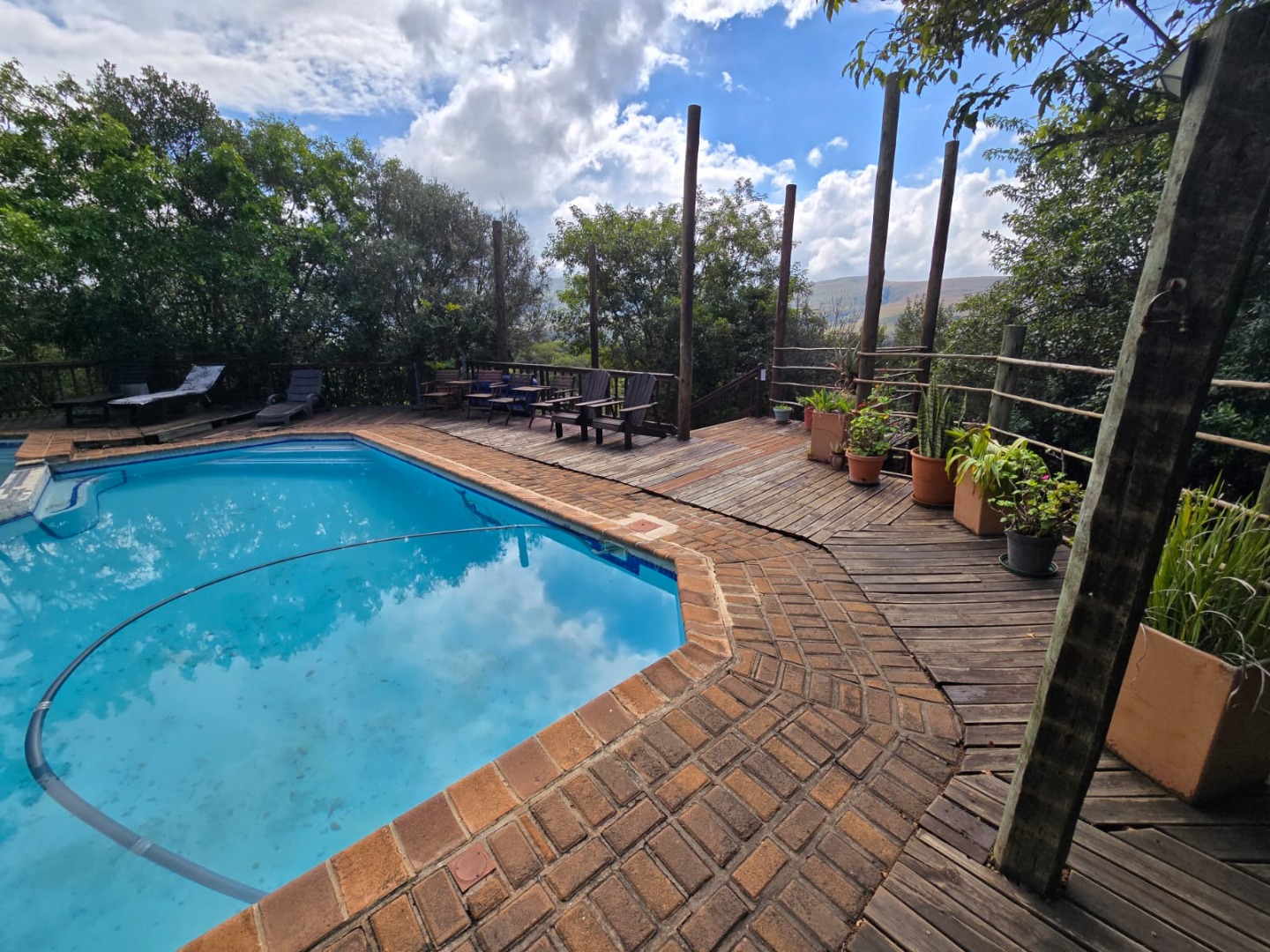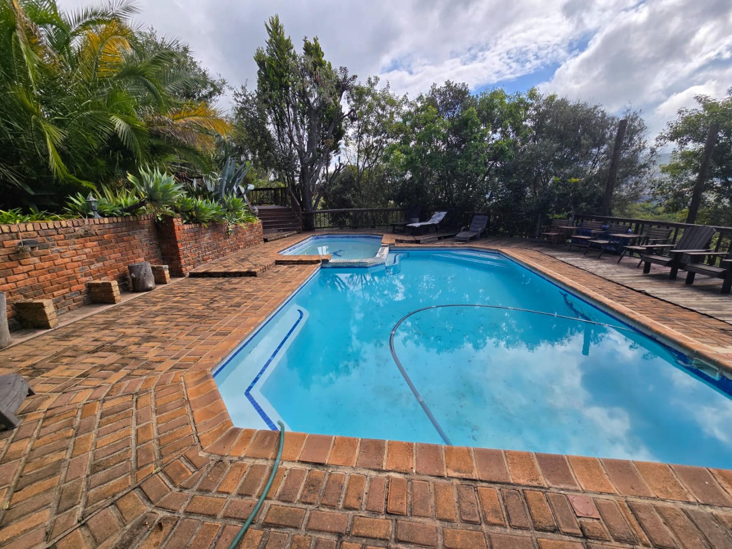 Outdoors, guests can enjoy a built-in braai area, a generous deck with stunning scenic views, and a patio that’s perfect for relaxation or social gatherings. The lush garden surrounds a peaceful courtyard with a fountain, adding to the serene ambiance, while a sparkling swimming pool with sunlounger chairs offers the ideal retreat on warm days.