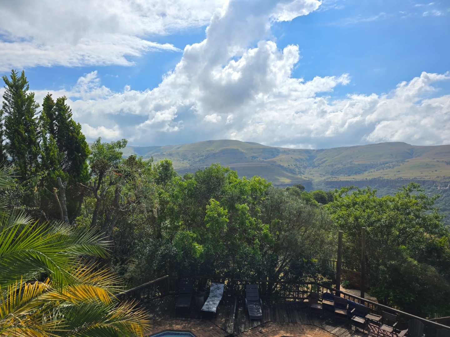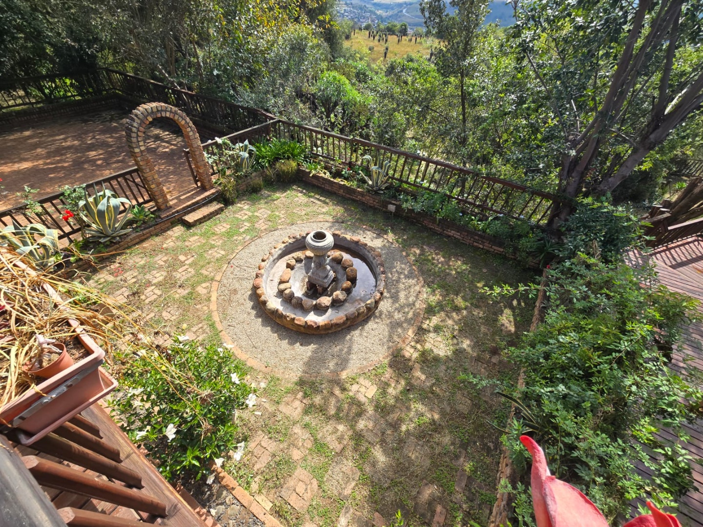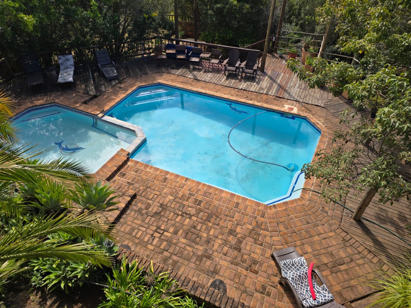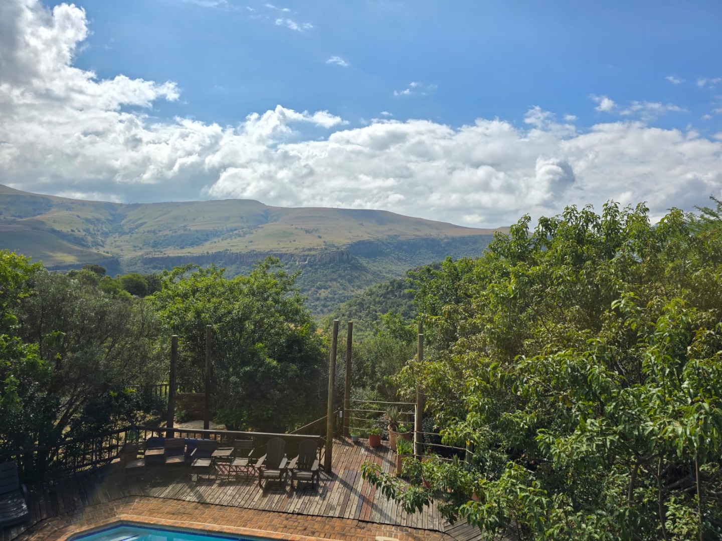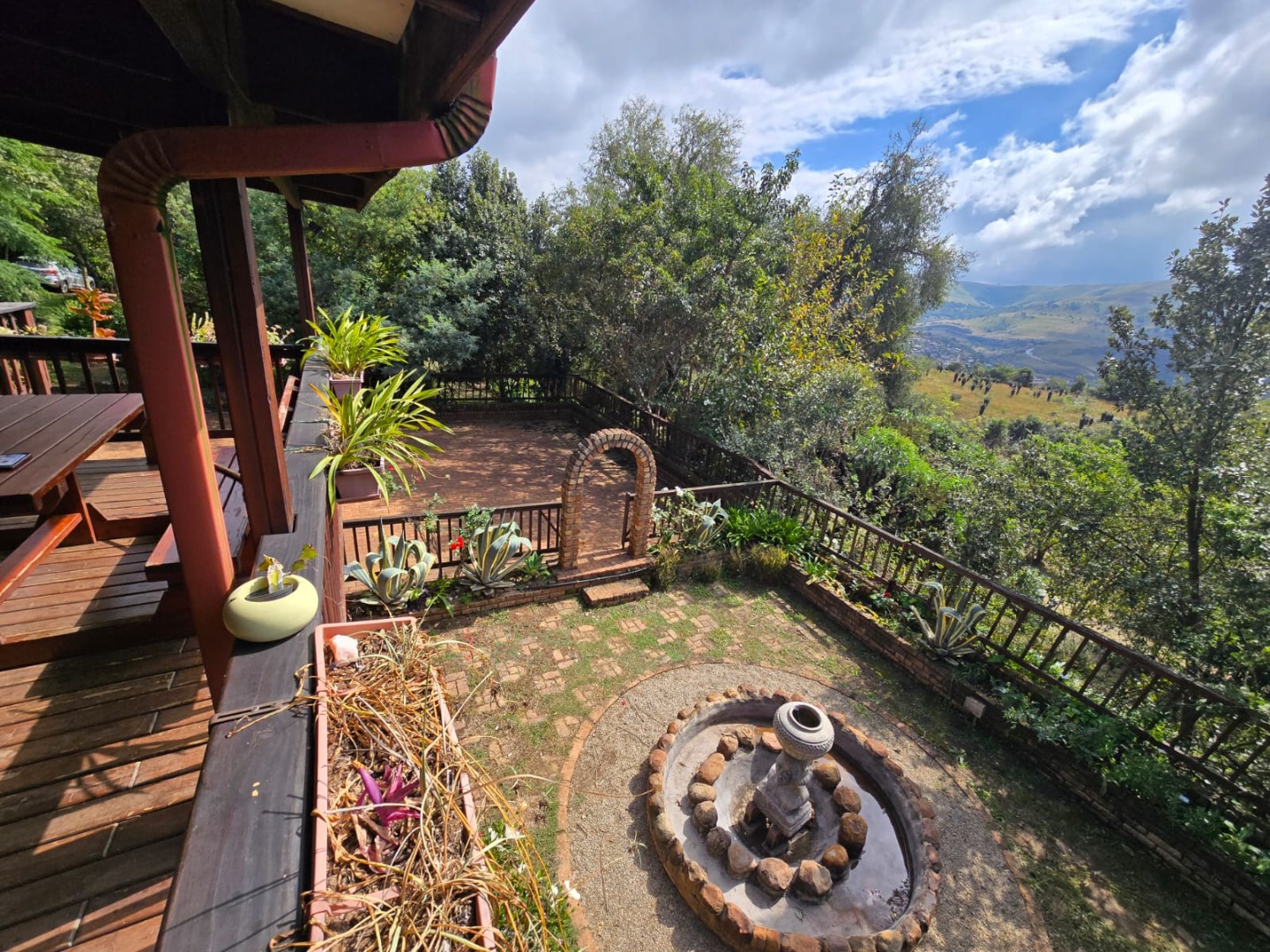 Outdoors, guests can enjoy a built-in braai area, a generous deck with stunning scenic views, and a patio that’s perfect for relaxation or social gatherings. The lush garden surrounds a peaceful courtyard with a fountain, adding to the serene ambiance, while a sparkling swimming pool with sunlounger chairs offers the ideal retreat on warm days.