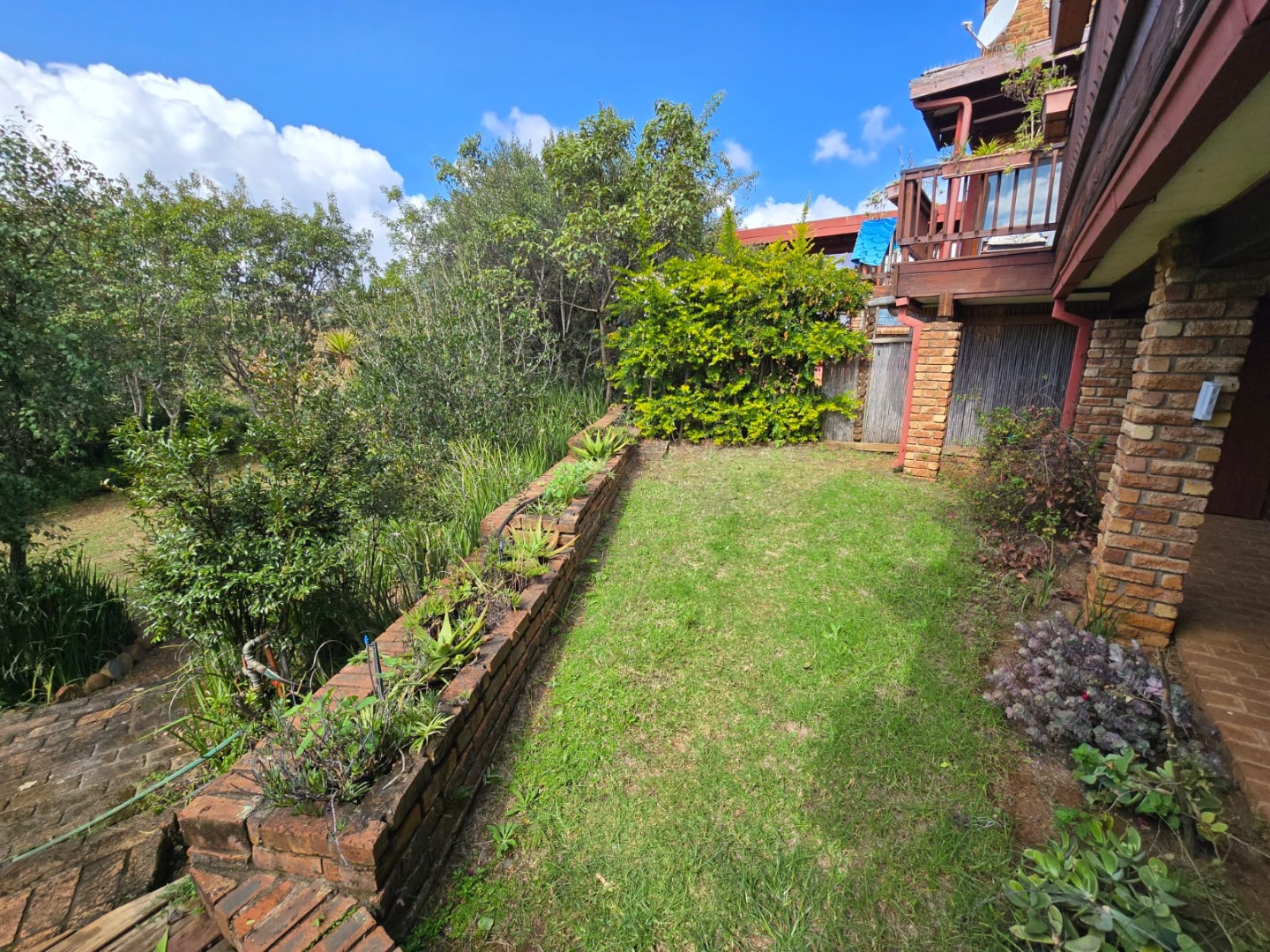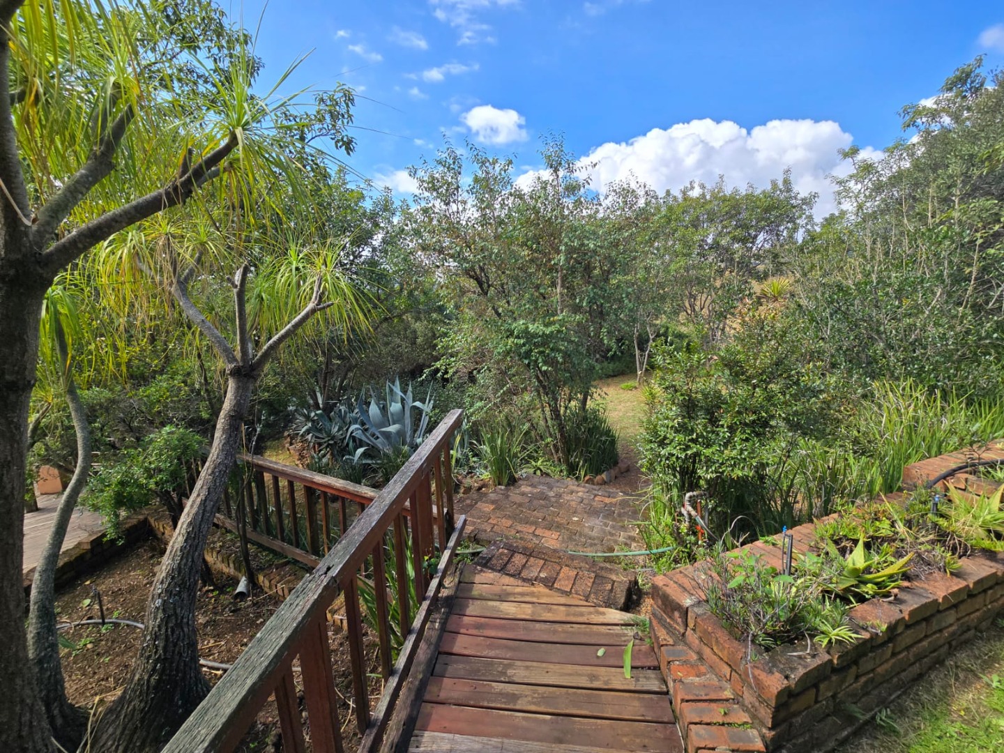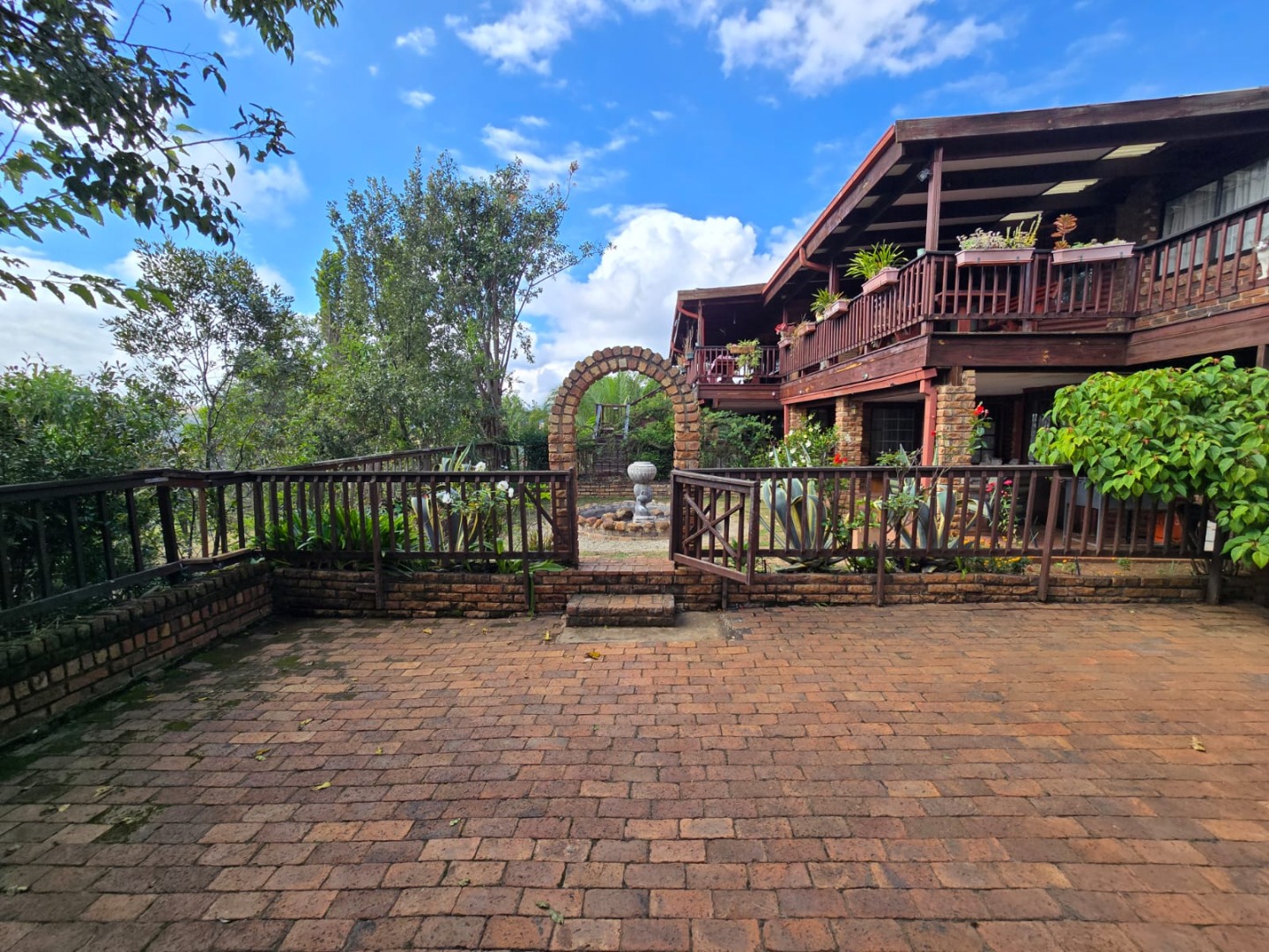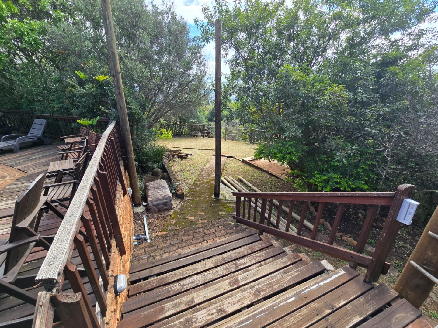 Outdoors, guests can enjoy a built-in braai area, a generous deck with stunning scenic views, and a patio that’s perfect for relaxation or social gatherings. The lush garden surrounds a peaceful courtyard with a fountain, adding to the serene ambiance, while a sparkling swimming pool with sunlounger chairs offers the ideal retreat on warm days.