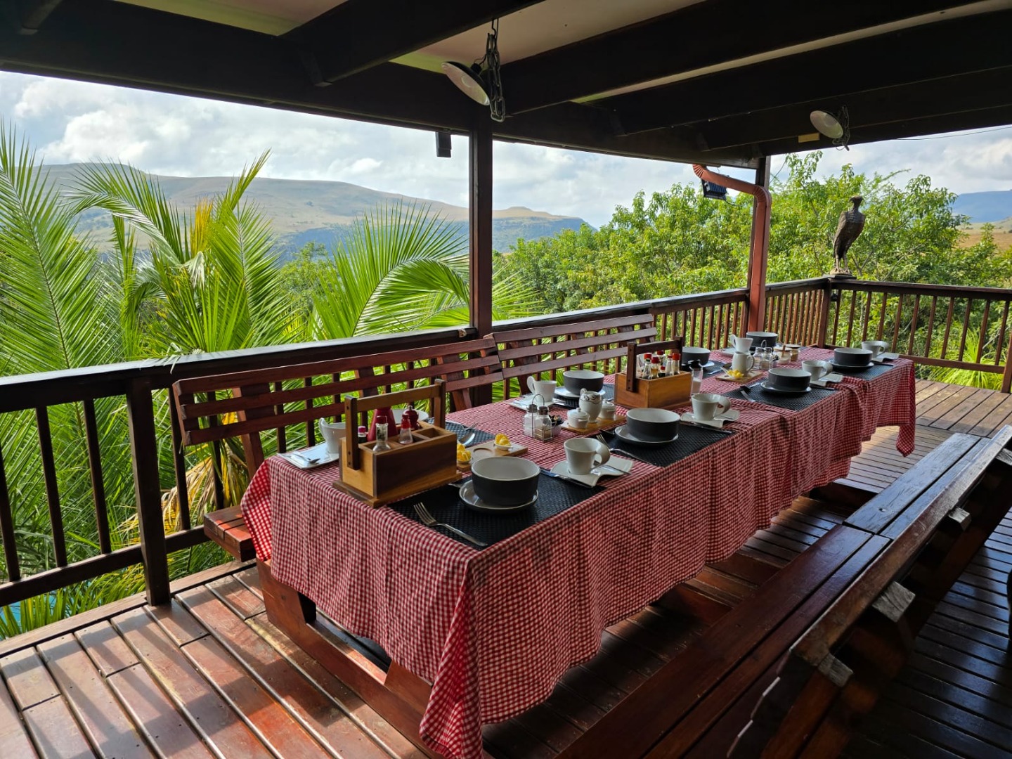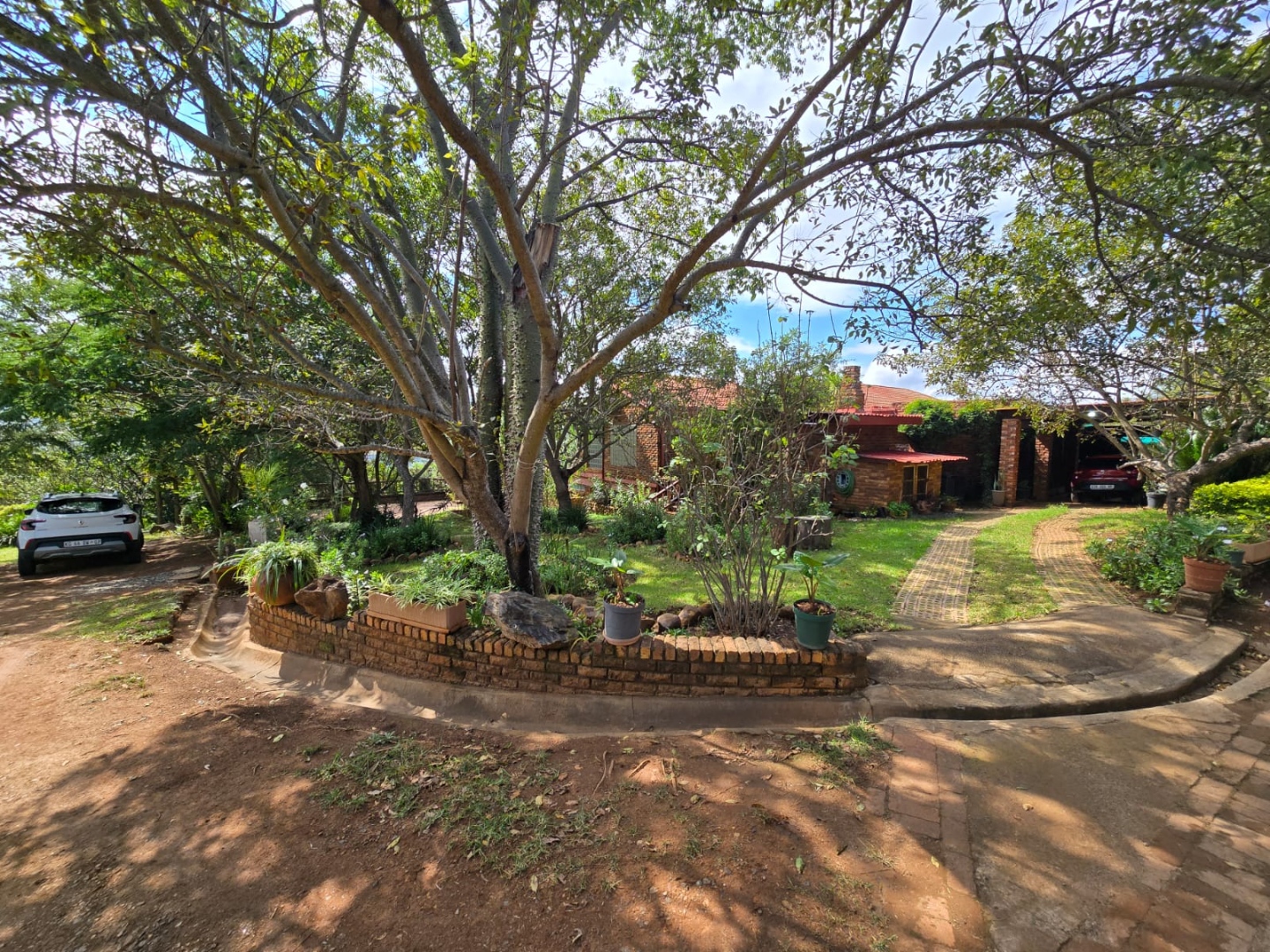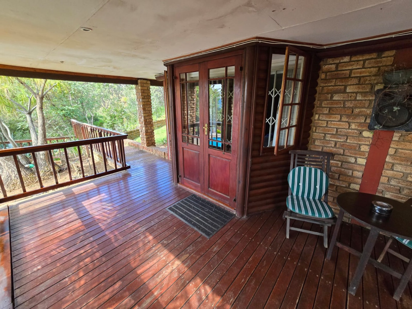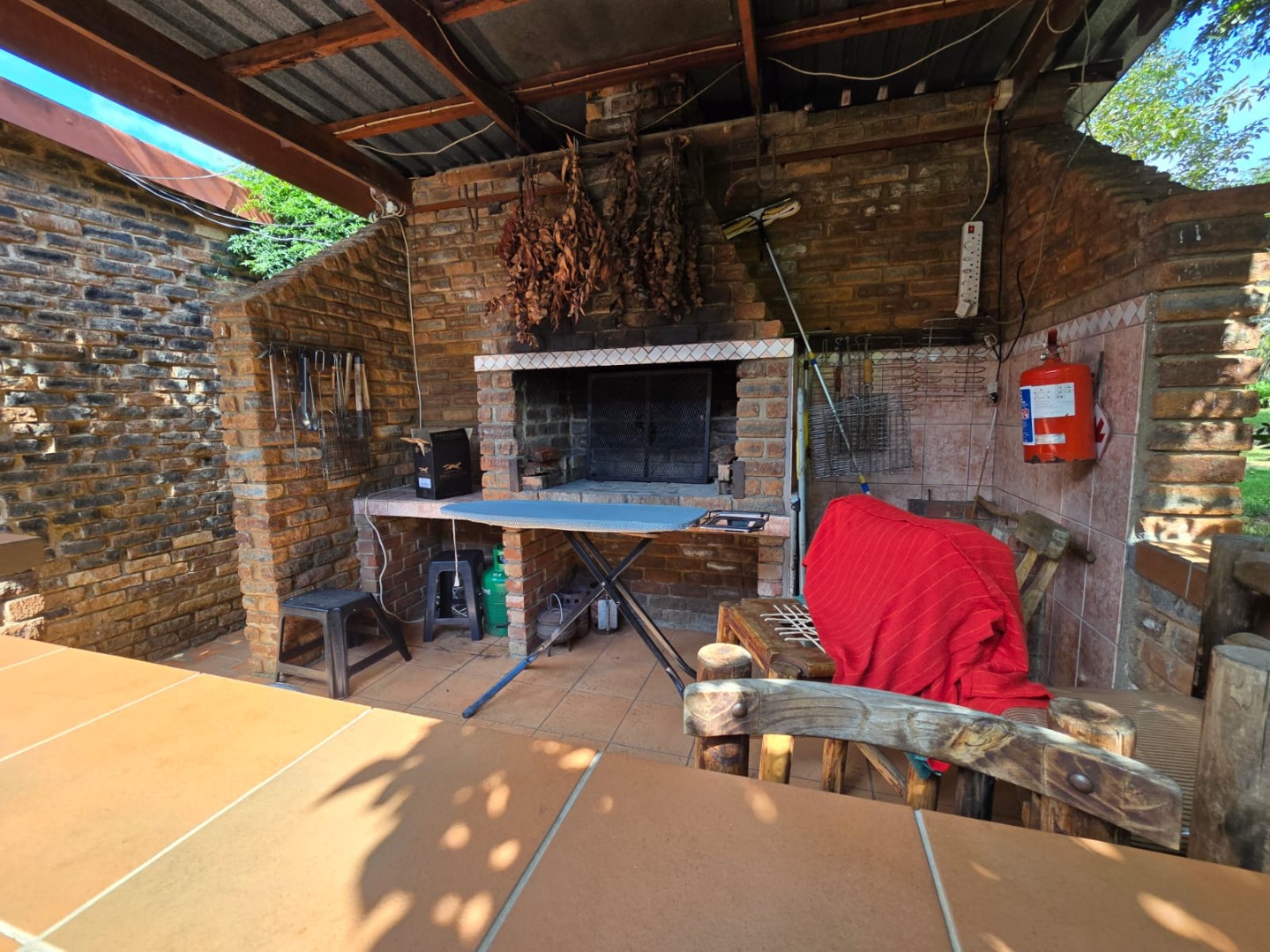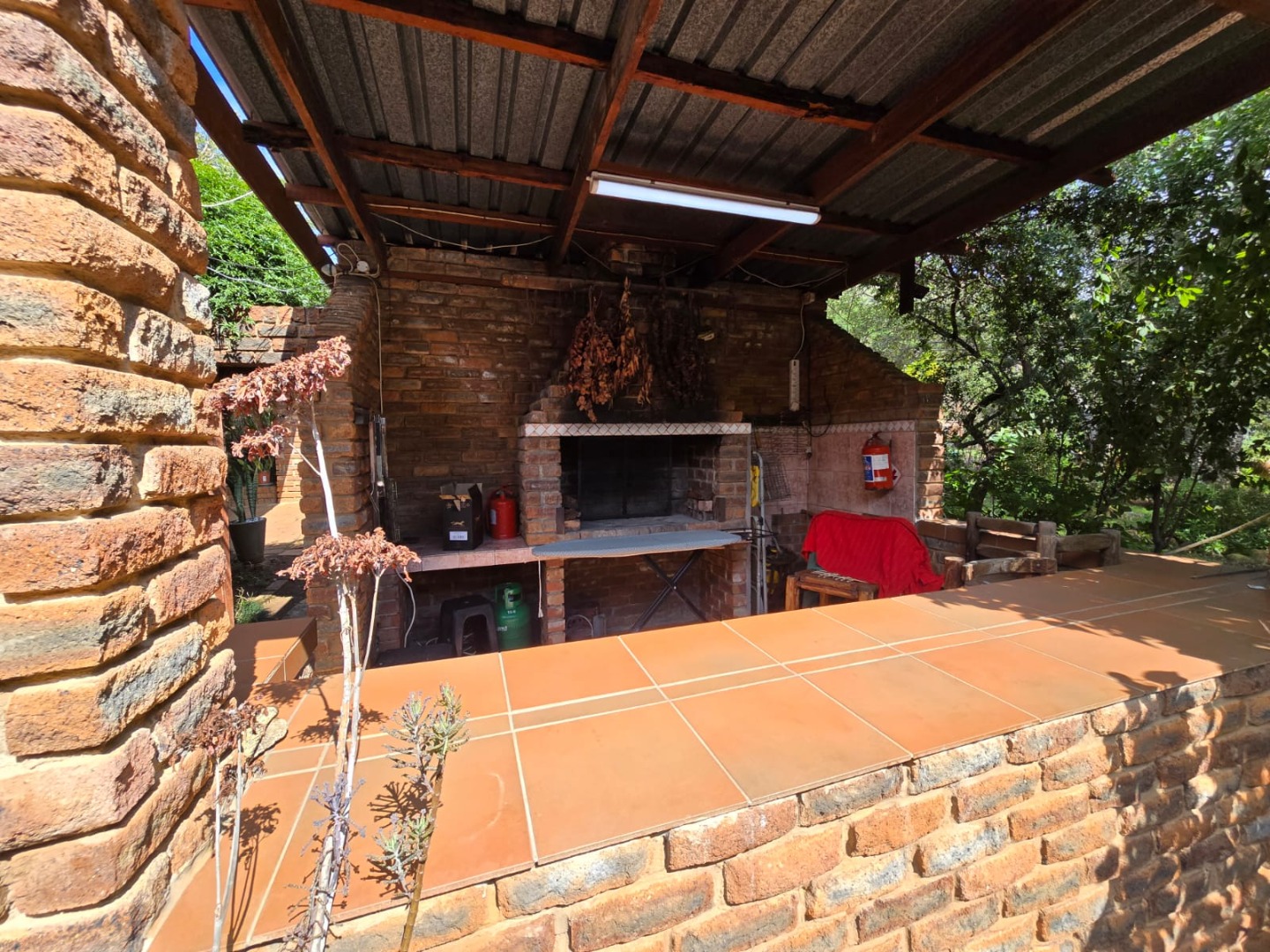 Outdoors, guests can enjoy a built-in braai area, a generous deck with stunning scenic views, and a patio that’s perfect for relaxation or social gatherings. The lush garden surrounds a peaceful courtyard with a fountain, adding to the serene ambiance, while a sparkling swimming pool with sunlounger chairs offers the ideal retreat on warm days.