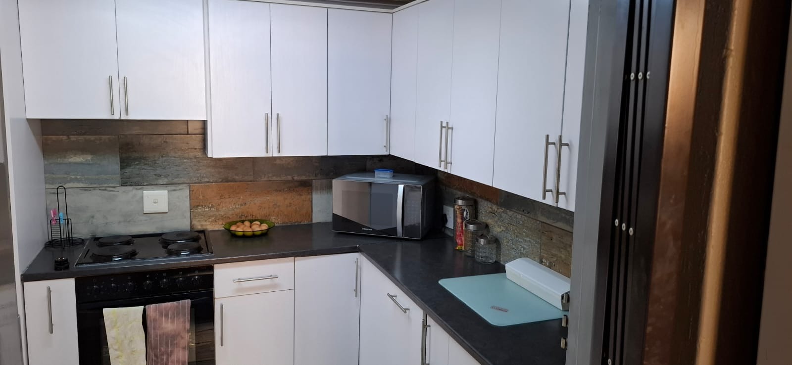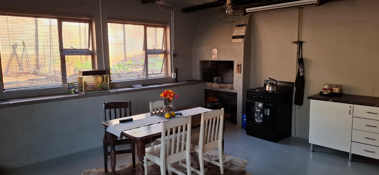 The interior features an inviting open-plan living space, characterized by a distinctive corrugated ceiling and concrete elements, creating a modern yet warm ambiance. A built-in braai room provides an ideal setting for entertaining, complemented by abundant natural light streaming through large windows. The functional kitchen is equipped with modern white cabinetry, dark countertops, and stove, offering ample storage and preparation space for culinary enthusiasts.